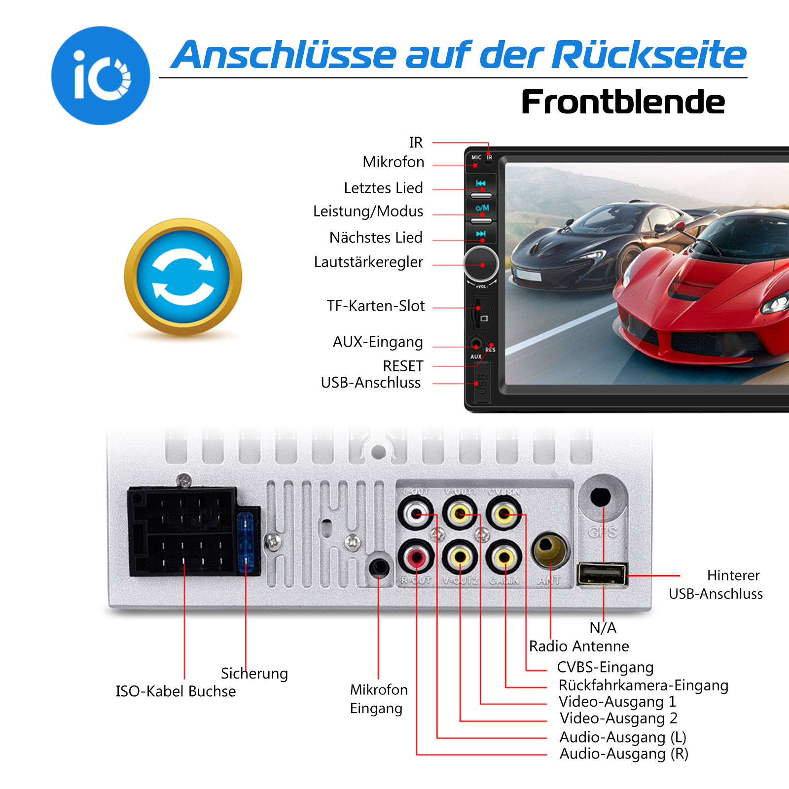 【Fahrzeugpassung und Multifunktionen】 Standardgröße, universelle Stromversorgung, Audiostecker, umfangreiche Funktionserweiterungsanschlüsse. Unser Doppel-DIN-Autoradio kann die Anforderungen der meisten Fahrzeuge erfüllen. Bitte bestätigen Sie vor der Bestellung, dass die Größe Ihrer Armaturenbrettöffnung geeignet ist. Zusätzliche Funktionen: USB/SD/Aux-Eingang, FM-Radio, Audio-/Video-Ausgang, Videoeingang für Front- und Rückfahrkamera. Arbeitsspannung: DC 12 V, maximale Ausgangsleistung: 4 x 60W.
