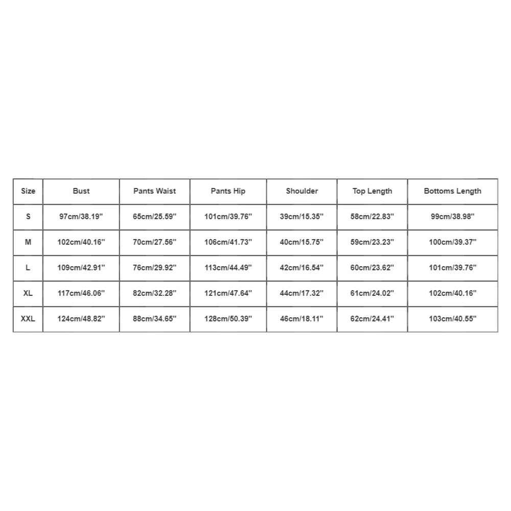 | Size:XXL | Bust:124cm/48.82'' | Pants Waist:88cm/34.65'' | Pants Hip:128cm/50.39'' | Shoulder:46cm/18.11'' | Top Length:62cm/24.41'' | Bottoms Length:103cm/40.55'' |