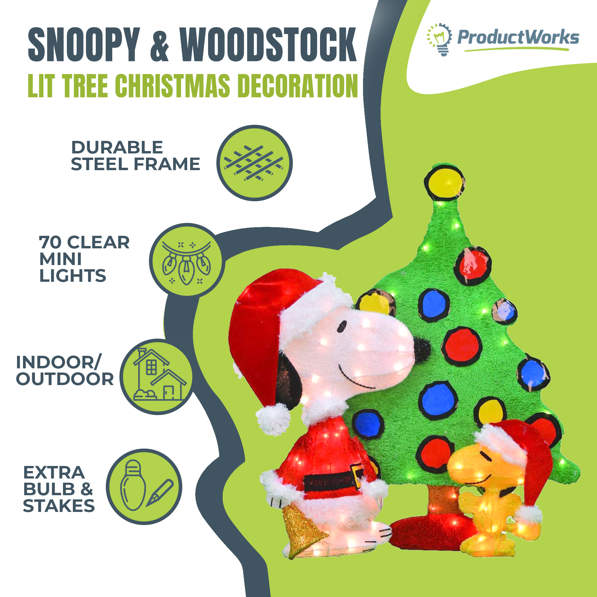 Transform your yard into a festive wonderland with the ProductWorks Peanuts Pre-Lit Snoopy and Woodstock Christmas Tree Indoor/Outdoor Holiday Yard Ornament. Standing 32 inches tall, this officially licensed holiday delight will capture the hearts of all ages with its charming depiction of Snoopy and Woodstock in a nostalgic Christmas Tree scene. Snoopy and Woodstock's festive cheer evokes a timeless sense of joy and nostalgia, making it an ideal centerpiece for your holiday decorations.