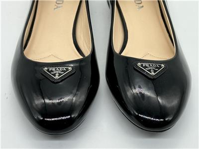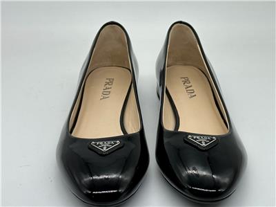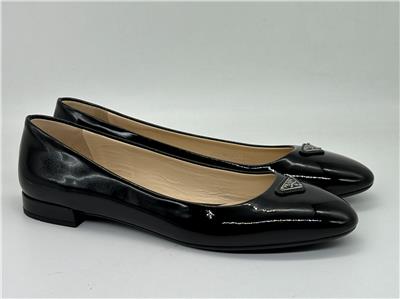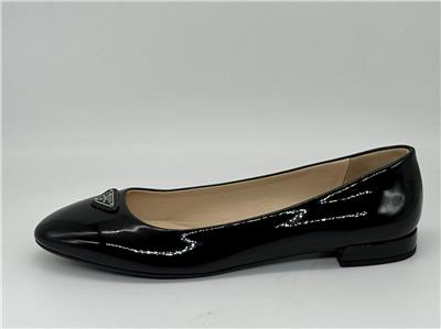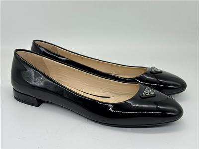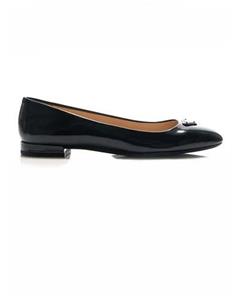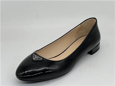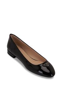 - A rounded toe nods to the ballerina-inspired design of this patent leather flat topped with signature triangle hardware and balanced on a low block heel