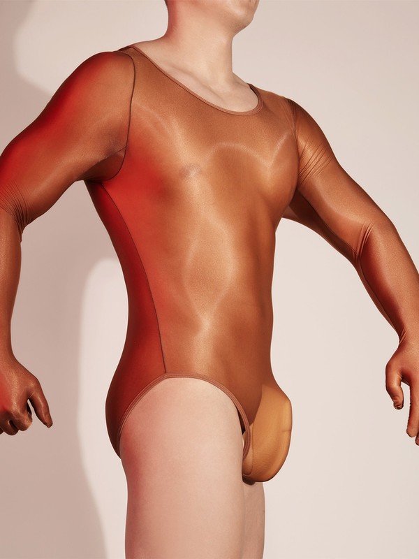 A piece of see-through and close-fitting long sleeve bodysuit for men.