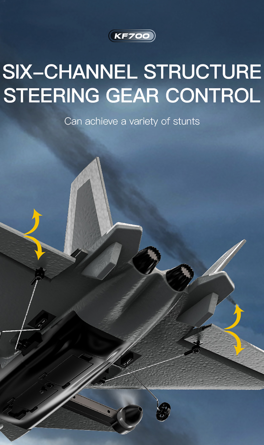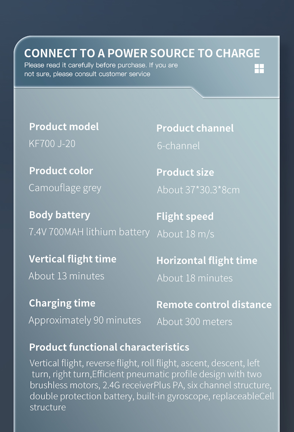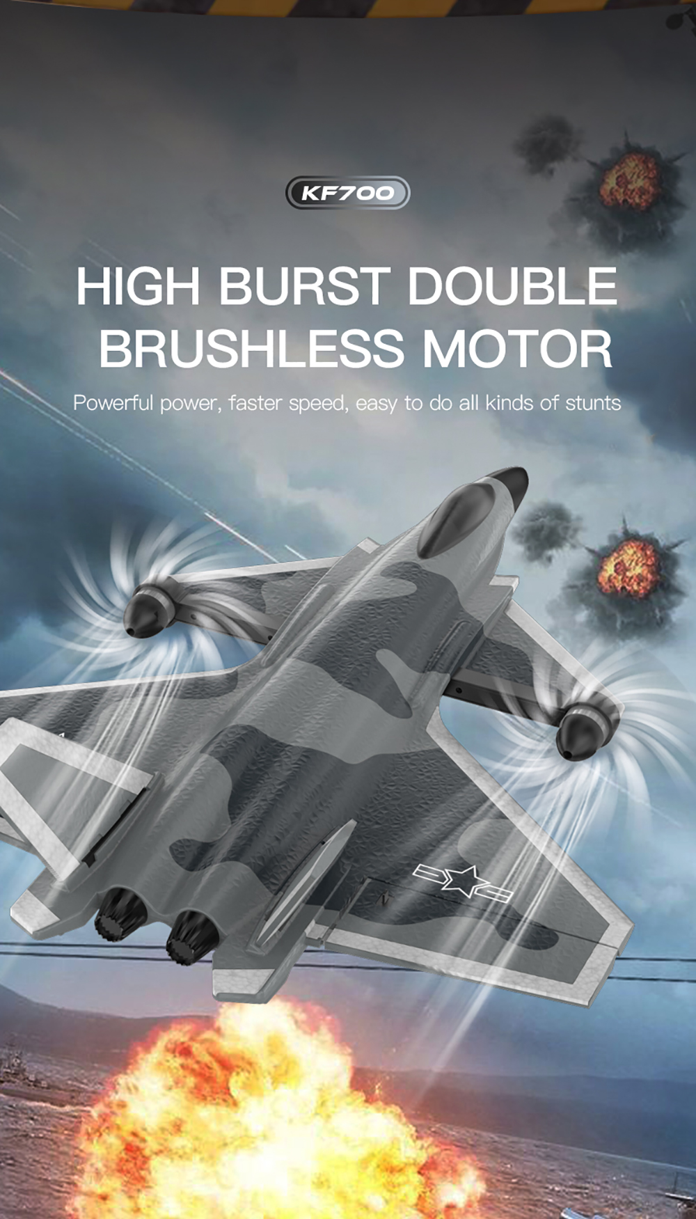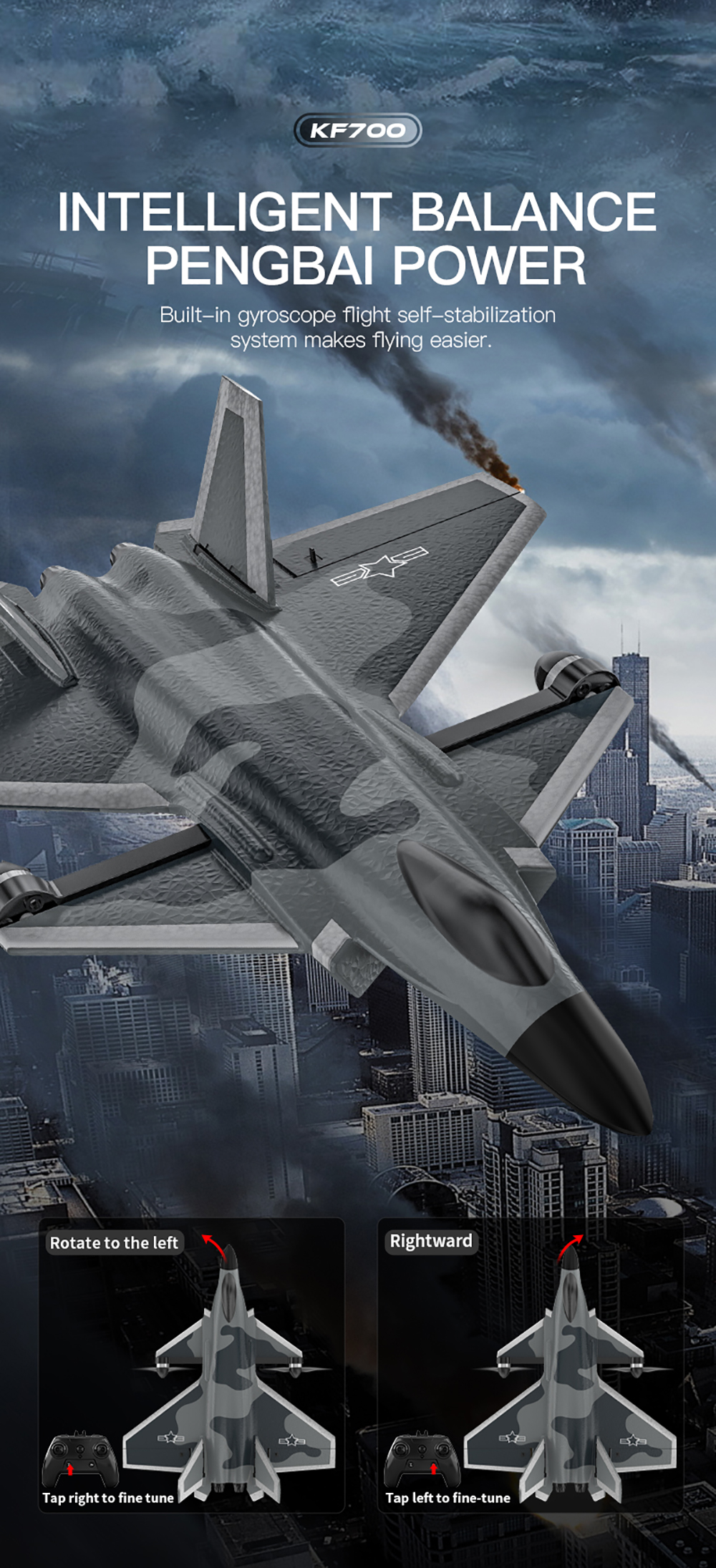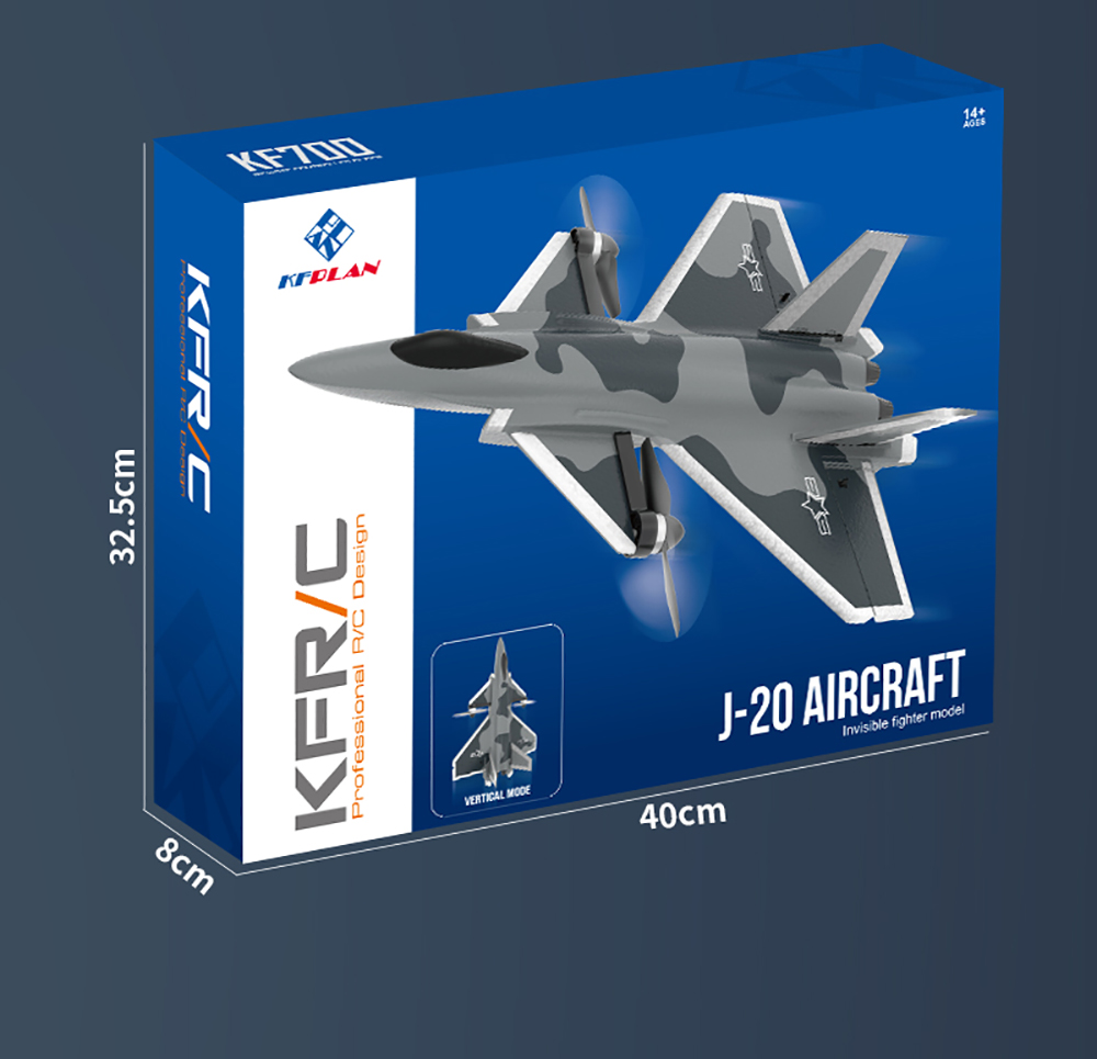 KF700 J-20 Glider functional, Vertical flight, reverse flight, roll flight, ascent, descent, leftturn, right turn,Efficient pneumatic profile design with twobrushless motors,2.4G receiverPlus PA, six channel structure.double protection battery, built-in gyroscope, replaceableCell structure.