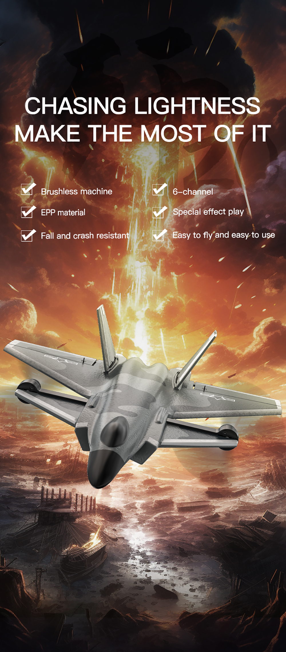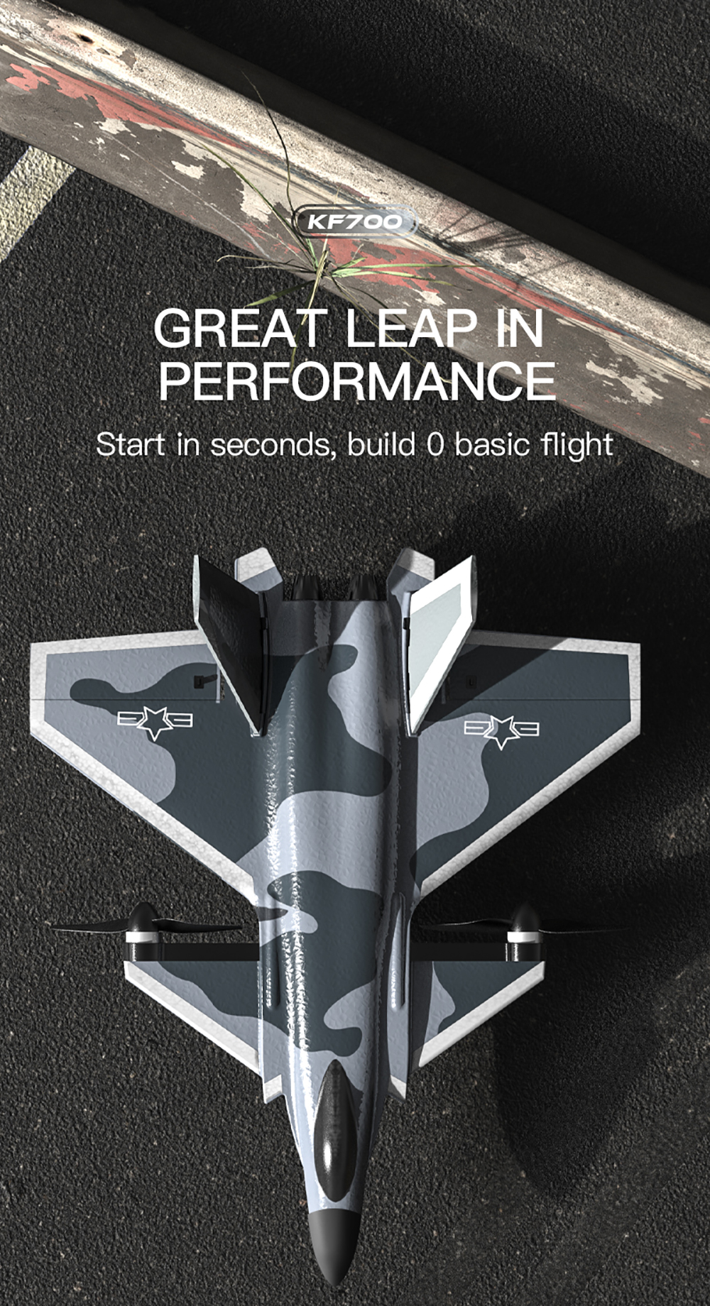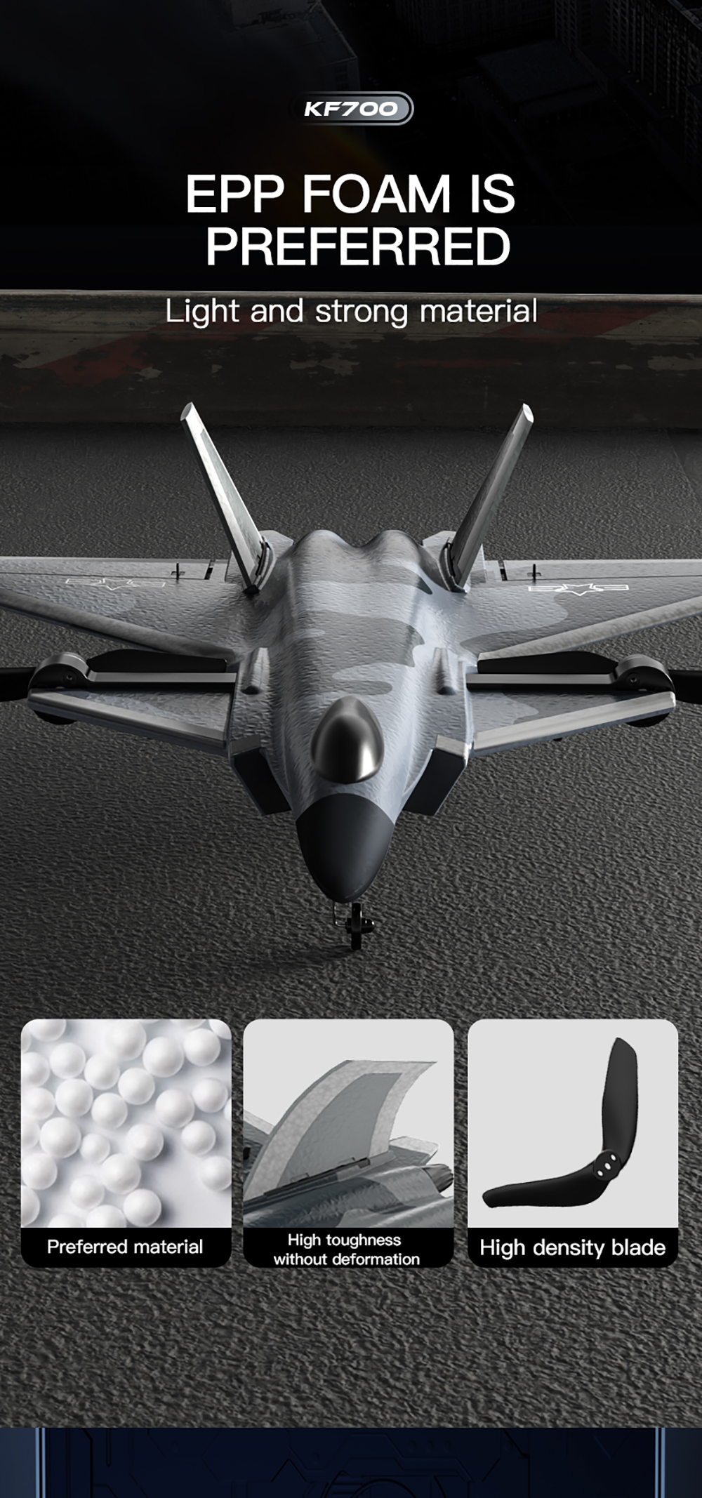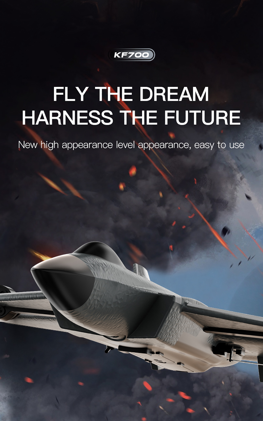 KF700 J-20 Glider functional, Vertical flight, reverse flight, roll flight, ascent, descent, leftturn, right turn,Efficient pneumatic profile design with twobrushless motors,2.4G receiverPlus PA, six channel structure.double protection battery, built-in gyroscope, replaceableCell structure.