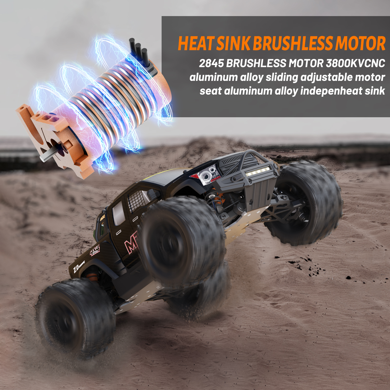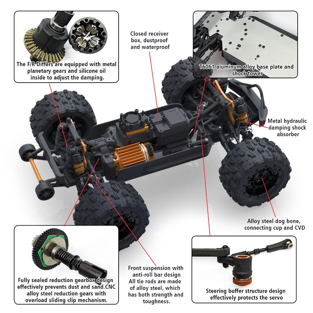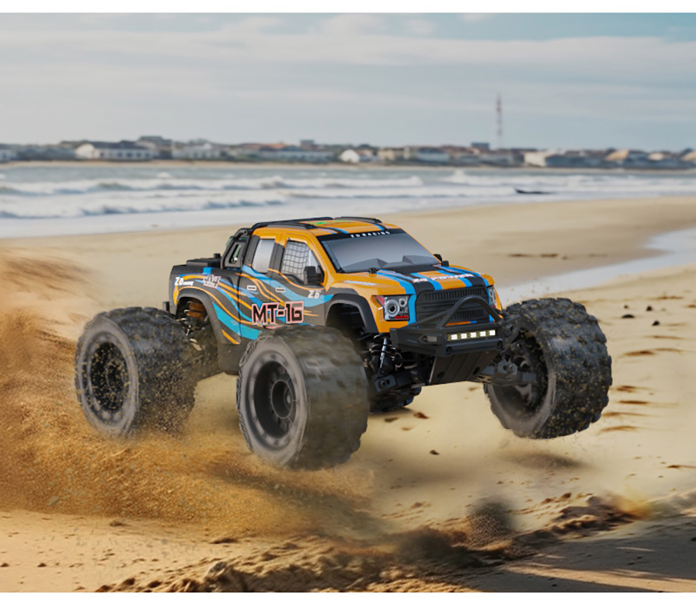 MT-16 4WD RC Car equipped with Rocket 2845 brushless motor 3600KV, 2.2kg full waterproof metal gears servo, 3 35C 2200mAh battery, 2.4G 4CH transmitter, the RC car speed is up to 80km/h and can deal with all kinds of rough roads like sands, meadow, gravel.