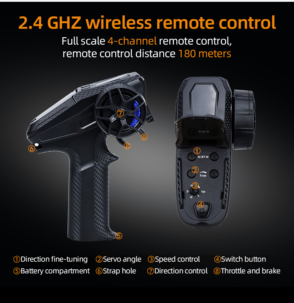 5. 2.4G Remote Control:The 2.4G remote control ensures a stable connection over a distance of about 120 meters, enabling smooth racing.
