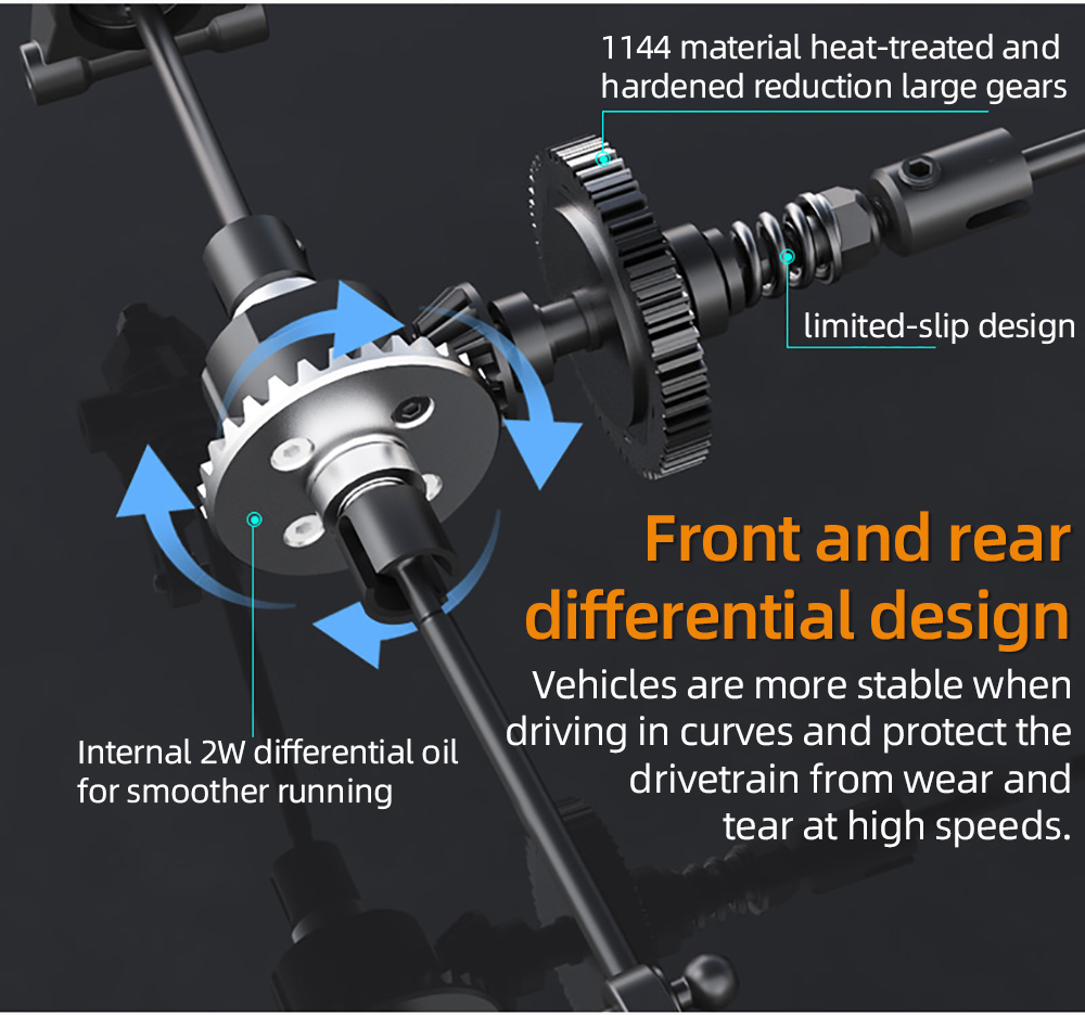 6. Strong suspension system with front and rear anti-sway bars, 50MM high ground clearance. Greatly improve the handling playability of the whole car.
