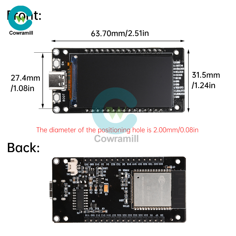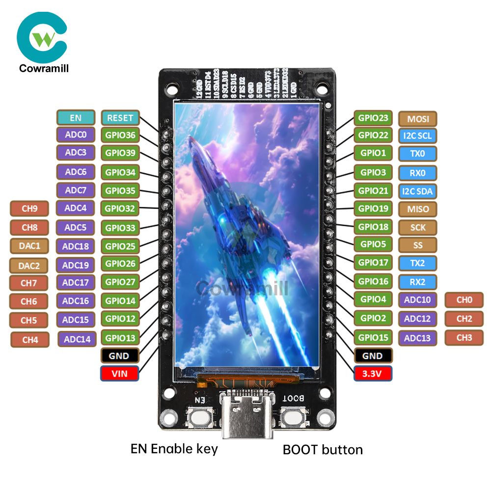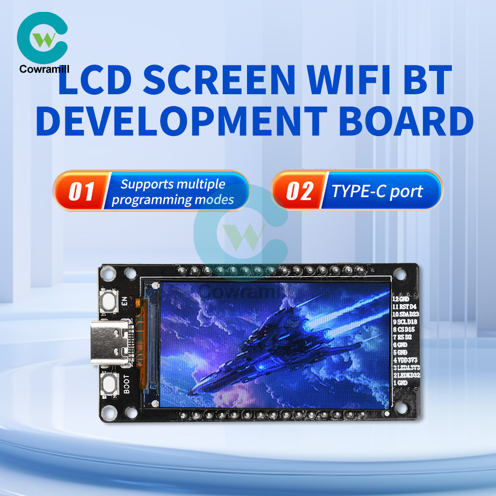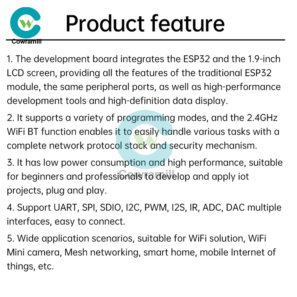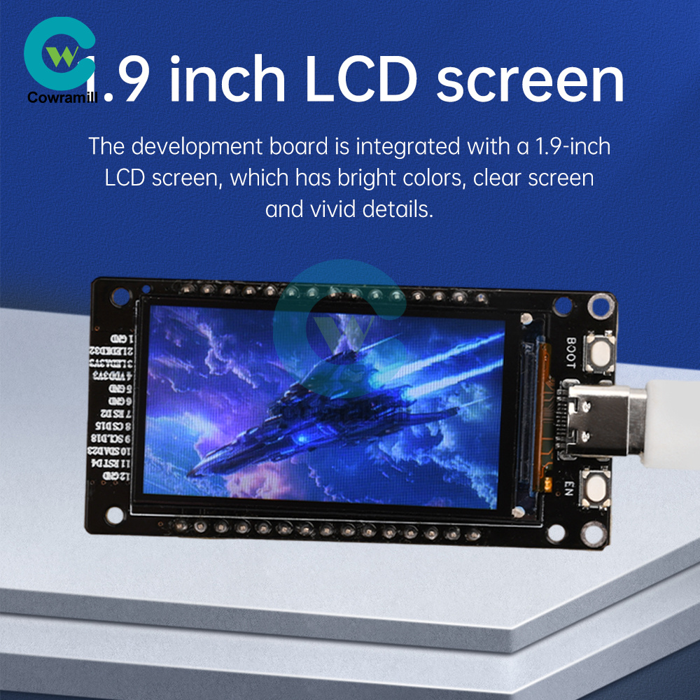 1.The development board integrates ESP32 and a 1.9-inch LCD screen, providing all the features of a traditional ESP32 module, the same peripheral ports, as well as high-performance development tools and high-definition data display.