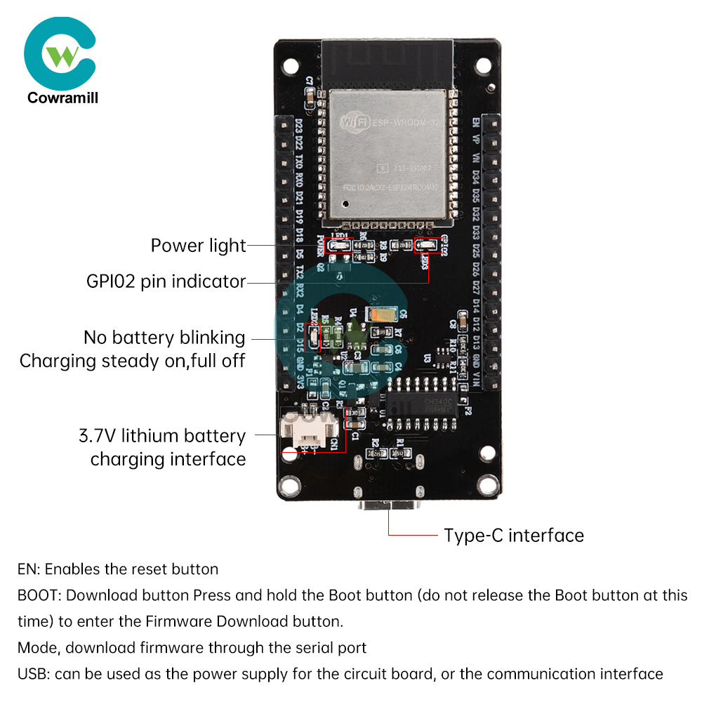 USB: can be used as the power supply of the board or the communication interface between PC and ESP32-WROOM-32 module.