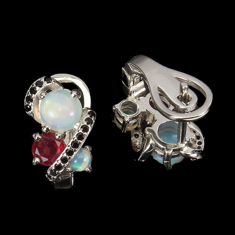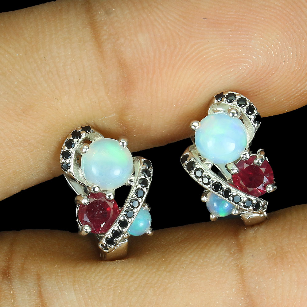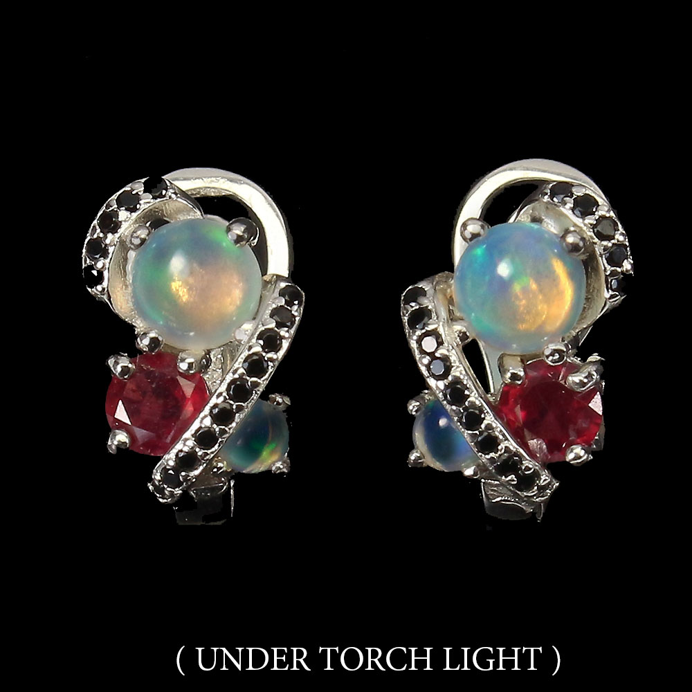 Unheated Round Fire Opal 5mm Black Spinel Ruby 925 Sterling Silver Earrings