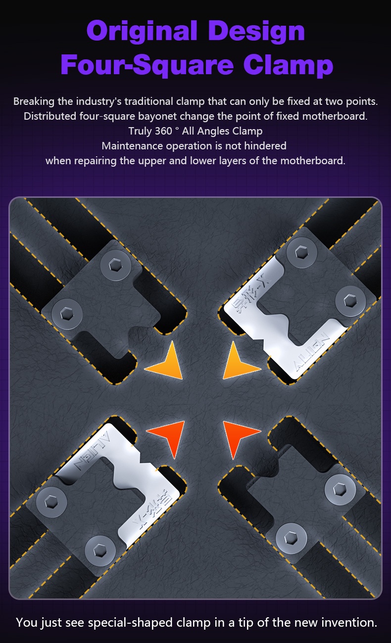 Breaking the traditional fixture that can only fix two points in the industry, the bayonets distributed around can change the fixing points of the motherboard, truly achieving 360 ° non dead angle clamping and repairing the upper and lower layers of the motherboard, achieving more perfect avoidance of empty space operation