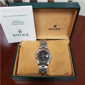 Introducing the 34mm Rolex Date Stainless Steel Watch (Model: 15200), a sleek and refined timepiece that embodies Rolex's hallmark craftsmanship and enduring style. This watch features a classic black dial with silver stick markers, offering a striking contrast that ensures easy readability and timeless elegance. The smooth stainless steel bezel further accentuates the streamlined aesthetic of the watch, giving it a clean, polished look suitable for any occasion.
