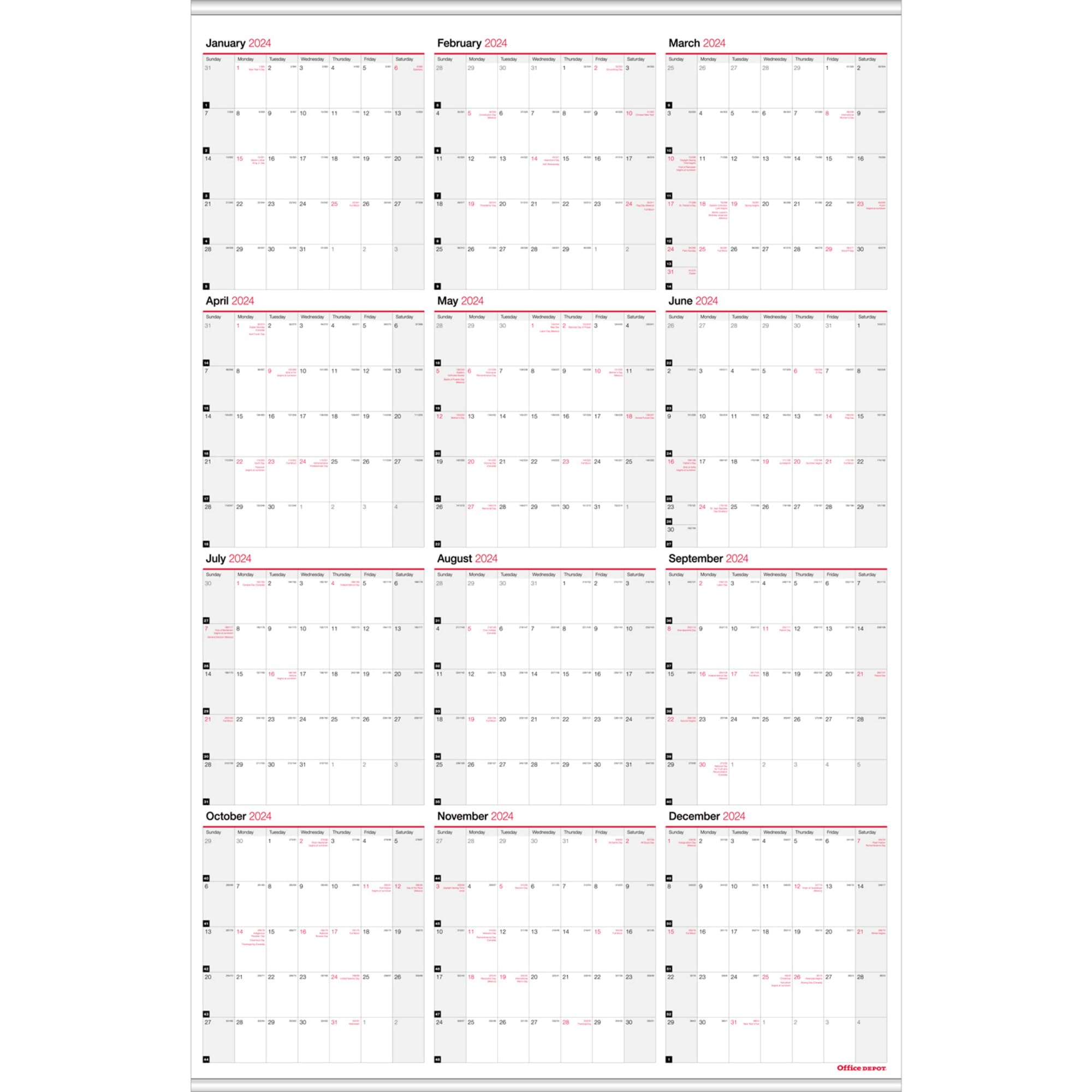 Choose the Office Depot Brand Yearly/Monthly Wall Calendar if you need to see the entire year at a glance. The calendar offers a quarterly format to break up the year, and its hanging tag makes it easy to get on your wall. Yearly layout with unruled daily blocks to allow open scheduling. Months in a quarterly format to help break up each year. 12 months: January to December. Metal binding at the top and bottom with a tag for hanging.