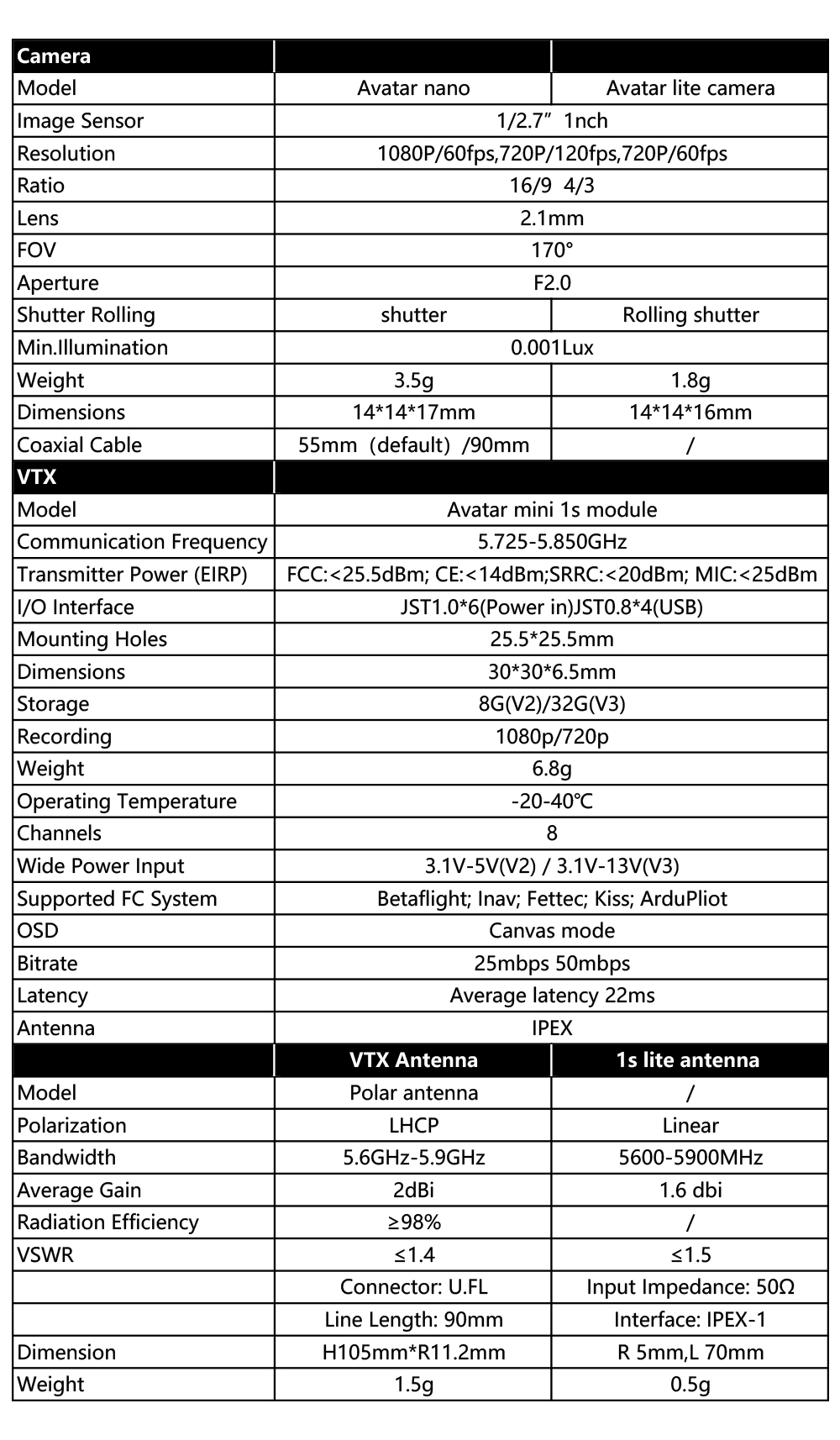 32G Built-in Storage: The Avatar mini 1s vtx comes with 8g built-in storage,it can record 1080p. with 60fps or 720pwith 100fps/60fps HD flight videos without interference.