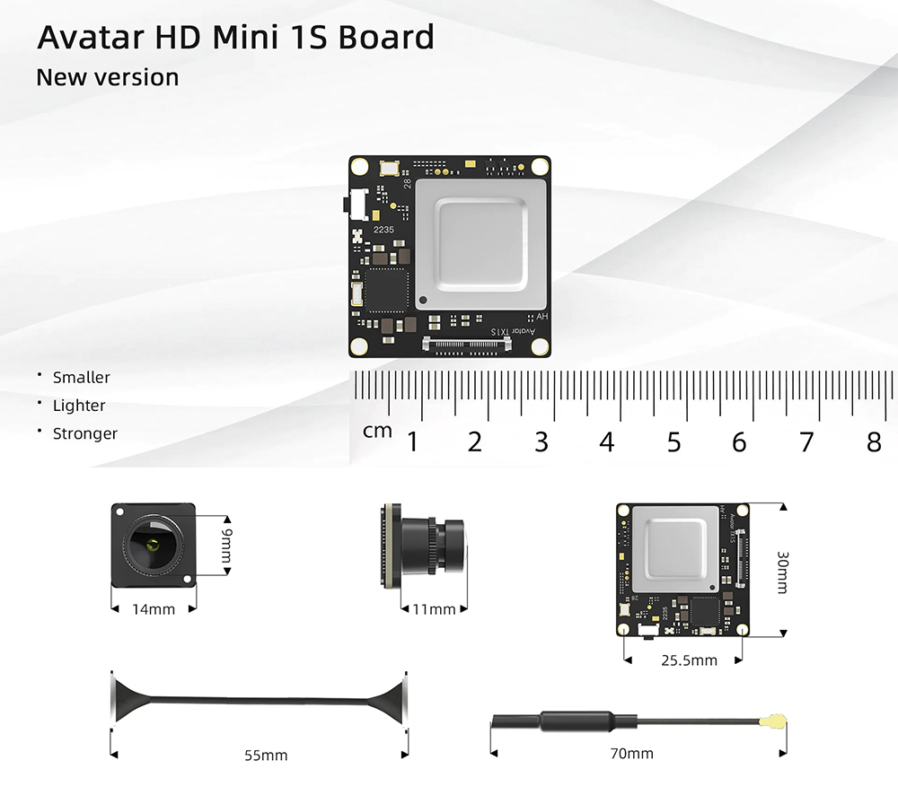New version of VTX: Avatar HD mini 1S lite kit comes with the smaller, lighter and stronger new version VTX board, 30*30mm size, 5.1g, which can be installed in smaller drones.