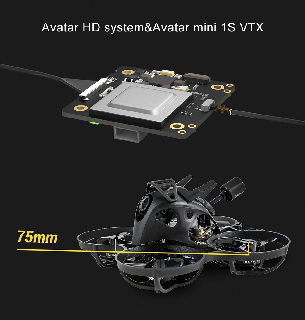 6.8g light weight board: The Avatar mini 1S VTX weights only 6.8g and fits perfectly with the 75X quad.
