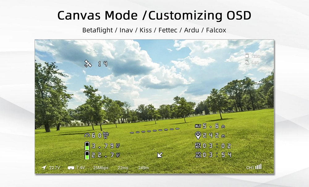 Canvas Mode: Supporting Betaflight, kiss, Inav, Ardu full OSD display and customization, you'll be able to customize various OSD fonts, colors and patterns you like and easily adjust the parameters you want via remote control.
