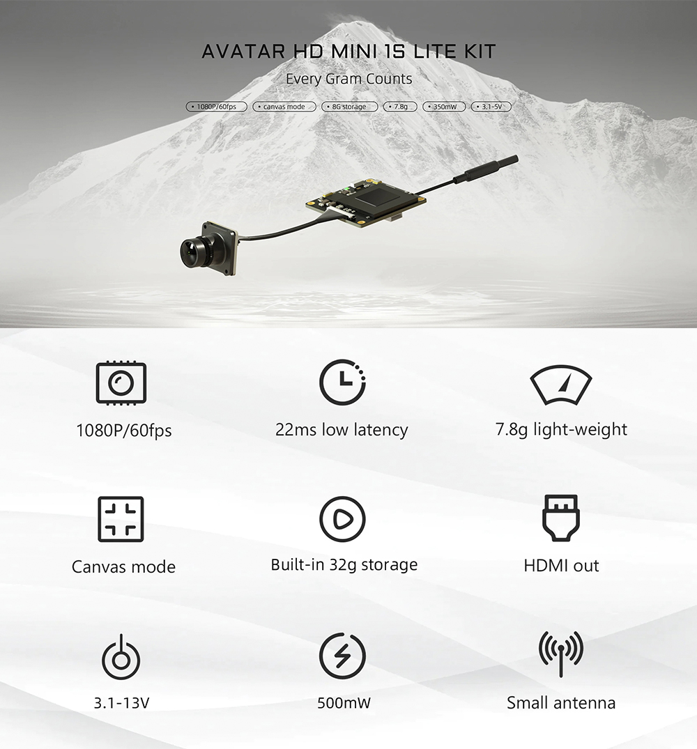 High quality, low latency: Weighing only 7.8g, but avatar mini 1s lite kit supports 1080P/60fps, 720P/100fps high definition FPV image quality with a average 22ms ultral-low latency, bring you a beautiful clear 1080P digital FPV video and an unforgettable flying experience.
