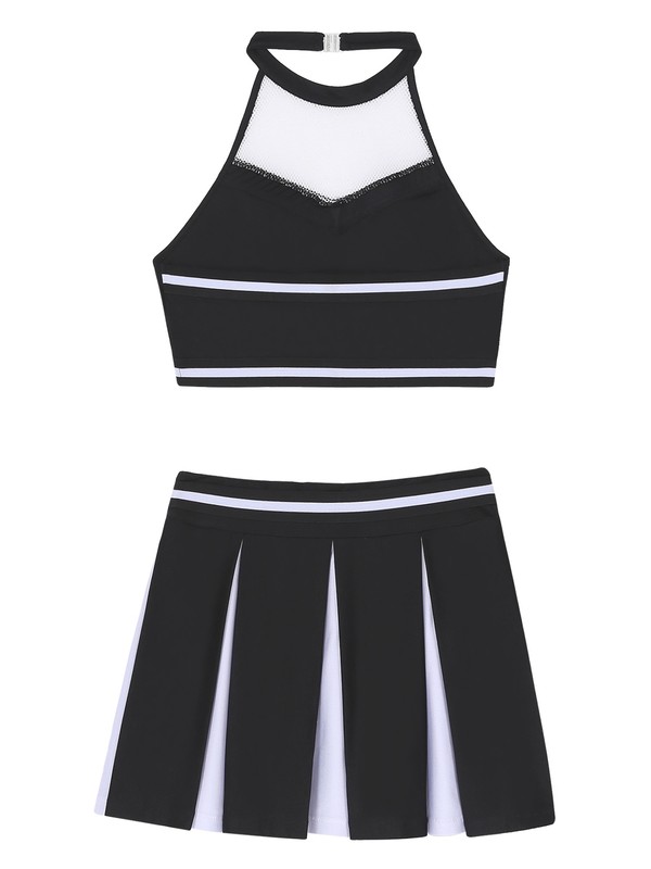 Womens Cheerleading Costume Mesh Patchwork Letter Printing Crop Top with Pleated Skirt.