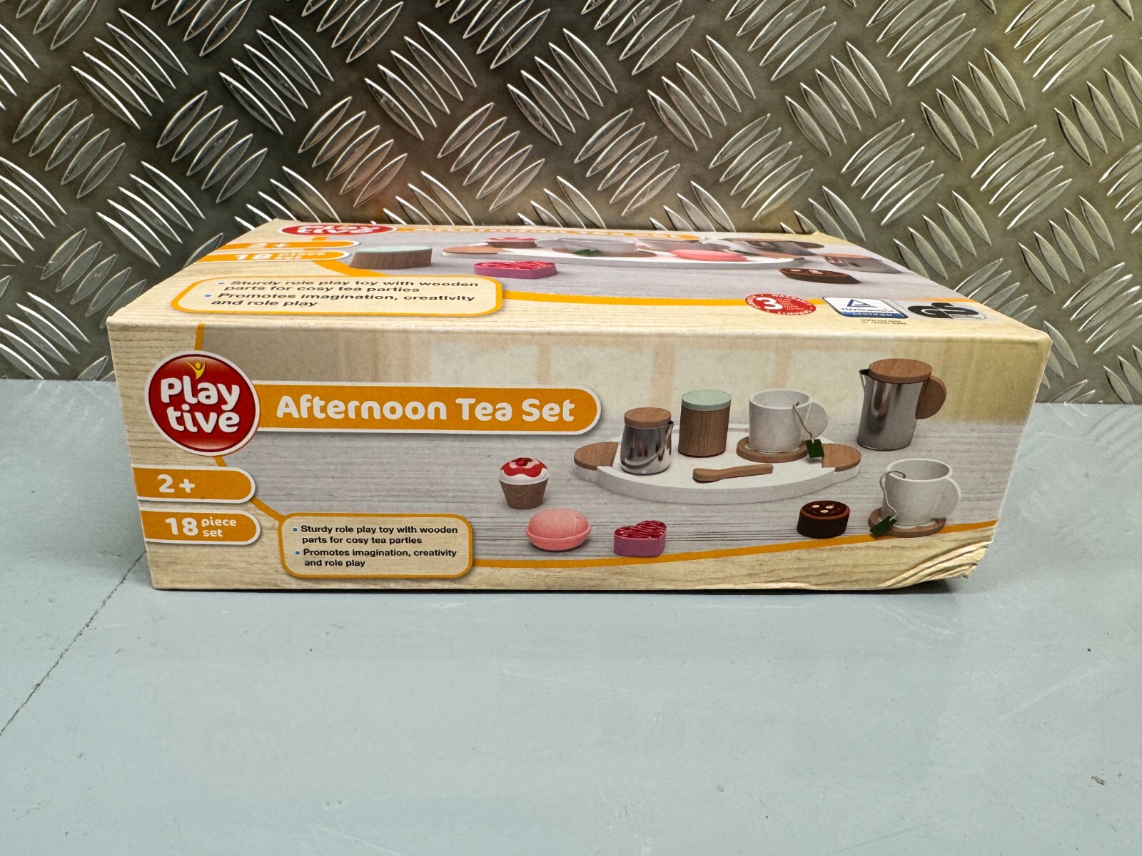 With tray, sugar container with 1 sugar spoon, 2 coasters, 4 wooden cakes, 1 teapot with removable lid, 1 metal milk jug, 2 cups made from food-safe plastic and 2 felt tea bags