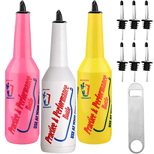 Features: - Learn Moves Like the Pro's! Good tool to learn flair moves - Perfect to learn working flair moves that you can use on the job without worrying about broken glass. - It weighs in the same as an empty spirit bottle, giving you the feel of the real thing without the danger of broken glass. - The bottle comes with a free, plastic pourer too. Essential purchase for anyone into mixology and bartending with style Are you still worrying about breaking more tools during bartending? -Flair Bottle is suitable for professionals and amateurs. -When you have this set, you can practice more skills and make your guests and friends have a deeper impression. - Cool to have one for yourself and for your friends Capacity: 25oz/750ml Package Includes: 1 x White Practice bar bottle 1 x Pink Practice bar bottle 1 x Yellow Practice bar bottle 1 x Opener 3 x Plastic pour spout 6 x Stainless Steel Bottle Pourers