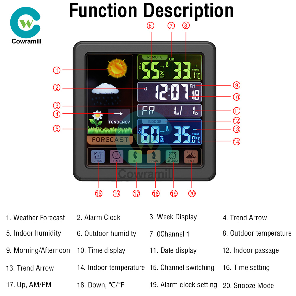 5. Outdoor temperature display: -20°C~70°C (-58°F~158°F) Error: ±1°C