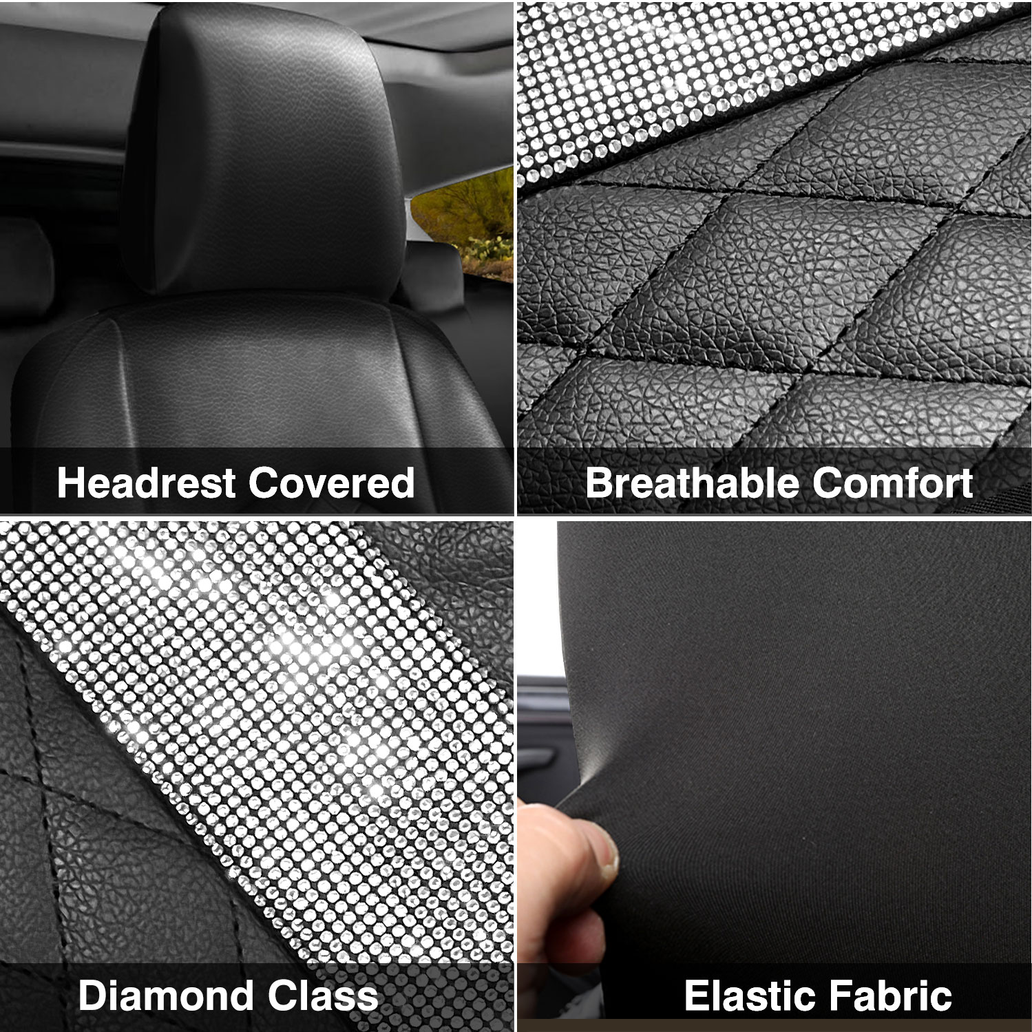 - BLING CAR SEAT COVERS: Premium Breathe Leather with pretty rhinestones Made. Black leather with shiny rhinestones, perfect for women, girls. Perfectly match your interior look. Ensure your seat covers will last for many years to come. Refresh your interior look. Beautiful design with good quality.