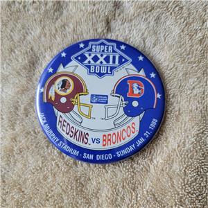 Offered for sale is this vintage Washington Redskins Super Bowl pinback button for the game at Jack Murphy Stadium on January 31, 1988 where Redskins played in Super Bowl XXII against Denver Broncos. Redskins beat the Broncos 42-10. Condition is good and ready to add to your Redskins collection. The button is in good vintage condition as indicated in the photos. The pinback button measures approximately 3 3/8 inches across.