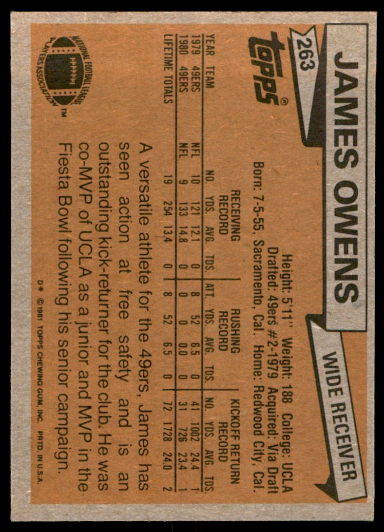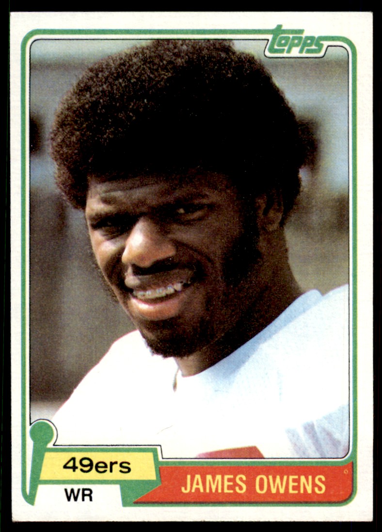 | Description: | James Owens | | Category: | Football | | Year: | 1981 | | Product: | Topps | | Team: | San Francisco 49ers | | Card Number: | 263 | | Rookie: | Yes | | Memorabilia: | . | | Special: | | | Dimensions: | 3½" x 2½" |