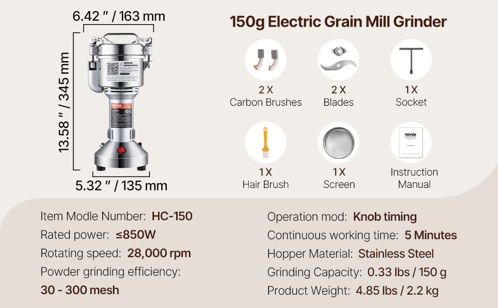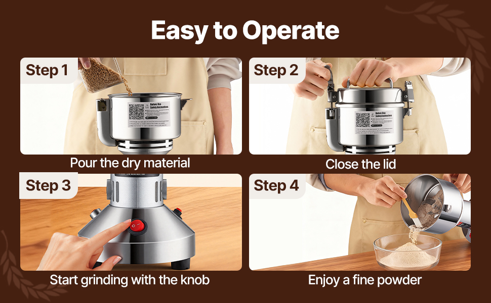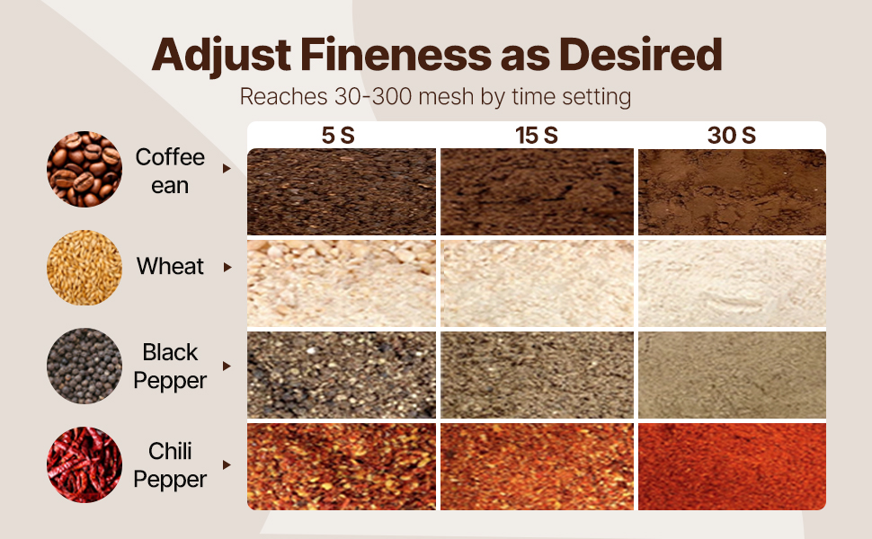 Macinacaffè a secco multiuso: la macchina per la polvere può lavorare vari materiali secchi, tra cui ① cereali (soia, mais, orzo, grano, avena, segale, piselli, chicchi di caffè), ② spezie (finocchio, pepe, cannella, rosmarino).