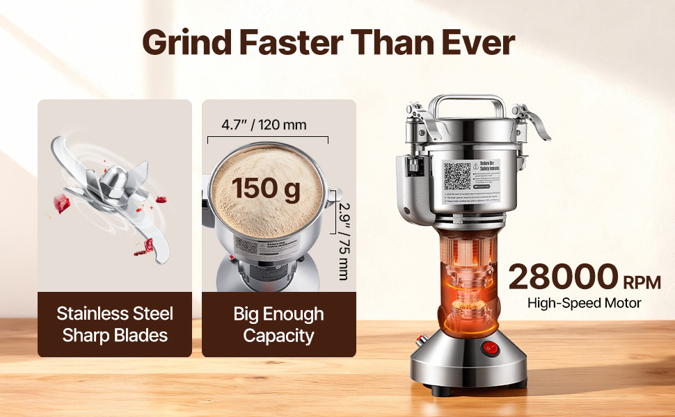 Macinazione potente: dotata di un motore in rame puro rinforzato e di una camera di macinazione in acciaio inossidabile spesso, funziona in modo costante e affidabile. Le lame in acciaio temprato a tre strati assicurano una macinazione rapida e fine.