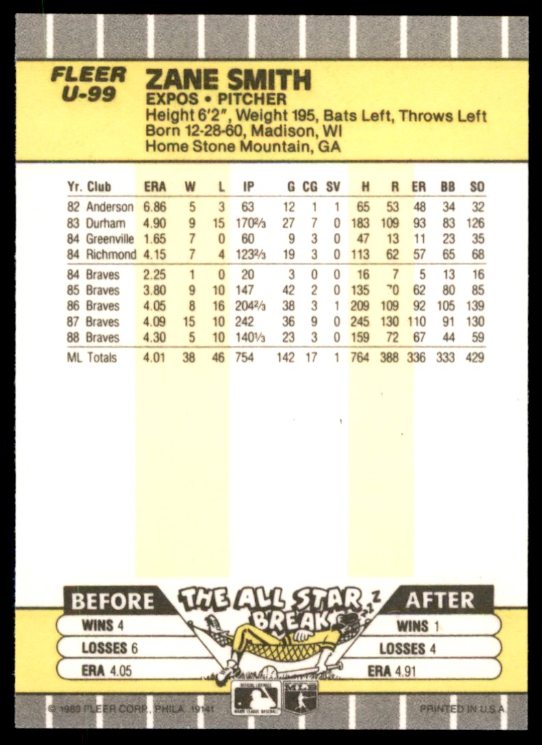| Description: | Zane Smith | | Category: | Baseball | | Year: | 1989 | | Product: | Fleer Update | | Team: | Montreal Expos | | Card Number: | U-99 | | Dimensions: | 3½" x 2½" |