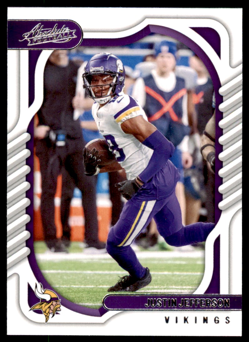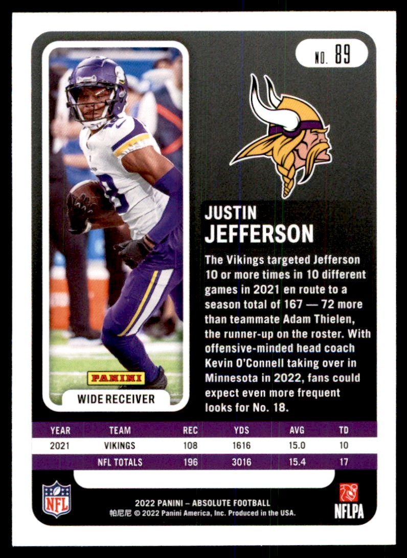 | Description: | Justin Jefferson | | Category: | Football | | Year: | 2022 | | Product: | Panini Absolute* | | Team: | Minnesota Vikings | | Card Number: | 89 | | Dimensions: | 3½" x 2½" |