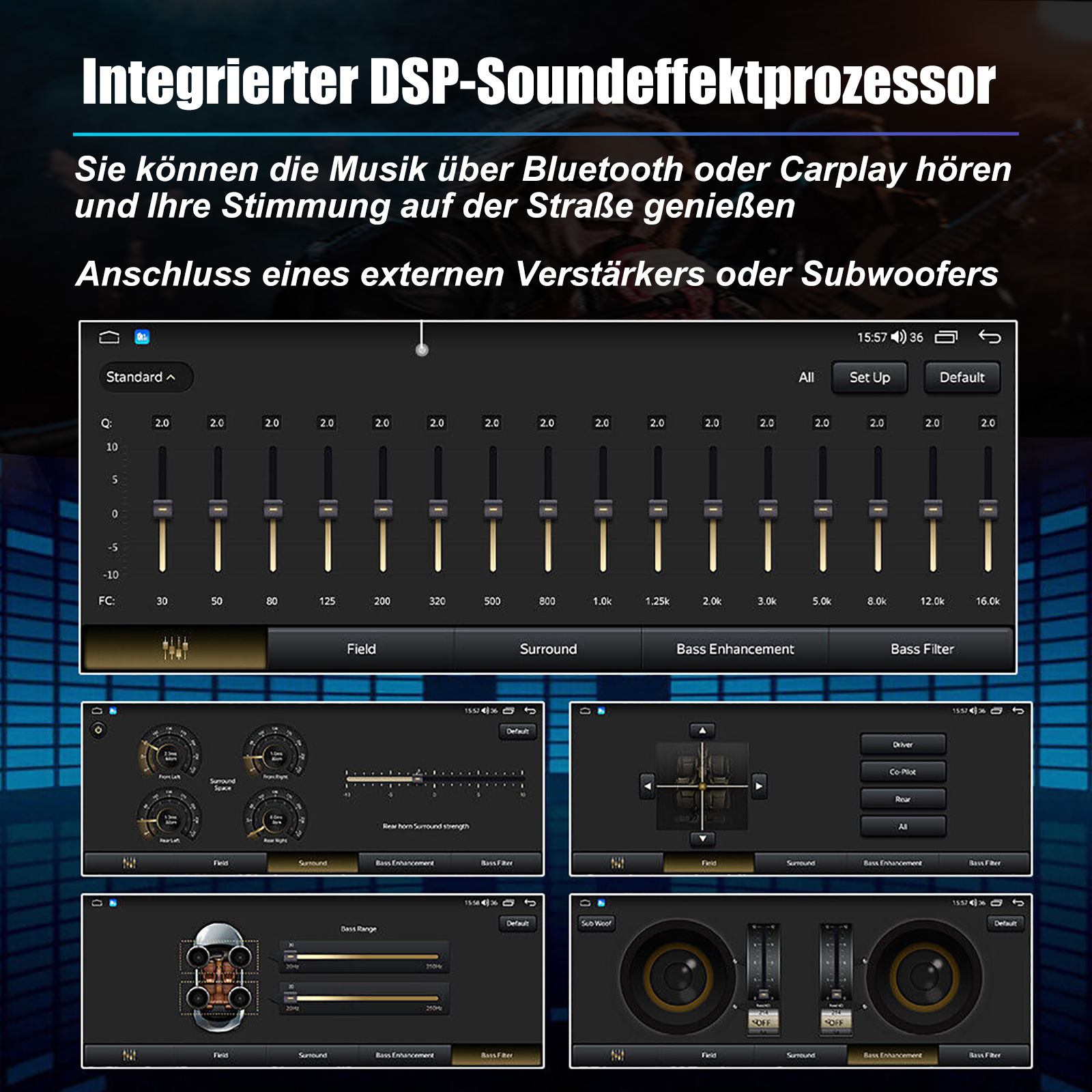 Bluetooth und DSP-Sound: Unterstützt Bluetooth 5,0, mit integriertem Mikrofon, damit Sie während der Fahrt freihändig telefonieren können. Unterstützt den Zugriff auf das Telefonbuch, die Musikwiedergabeschnittstelle usw. Eingebauter DSP-Chip. Unterstützt 36-Band-EQ-Einstellung, Mit der DSP-Funktion können Sie den Klang jedes Lautsprechers mithilfe verschiedener Entzerrungsmethoden individuell anpassen: Jazz, Rock, Pop, Klassik usw., um einen außergewöhnlichen Höreffekt für Sie zu erzielen!, die nach Ihren persönlichen Vorlieben eingestellt werden kann. 4 x 45W Verstärker, Surround-Sound und Subwoofer-Ausgang.