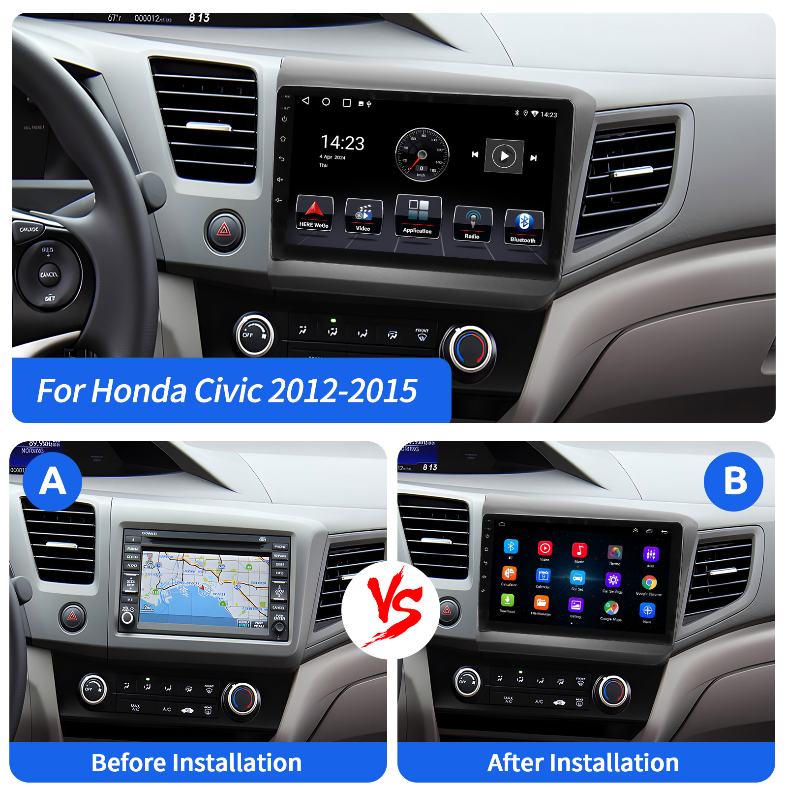 9 Inch Android 15 Car Radio For Honda Civic 2012-2015: The Android car radio with 9" 1280*720 IPS capacitive touch screen, 2GB RAM and 32GB ROM allows you to download your favorite apps and videos, so that driving will never be boring .No additional frame, no cable change, plug and play.