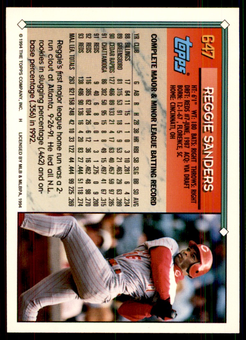 | Description: | Reggie Sanders | | Category: | Baseball | | Year: | 1994 | | Product: | Topps | | Team: | Baseball Card | | Card Number: | 647 | | Dimensions: | 3½" x 2½" |