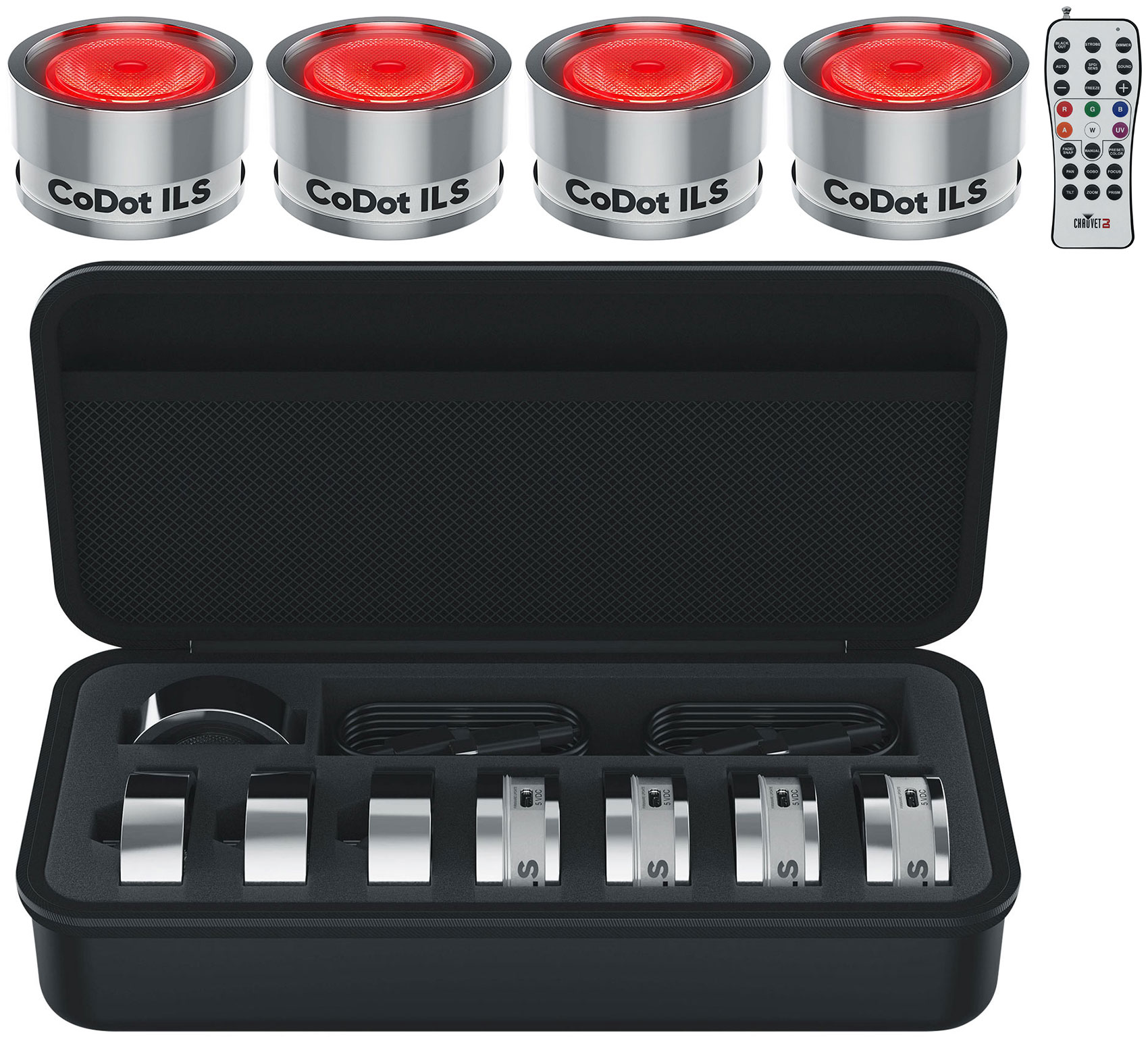 - (1) Chauvet DJ CoDot ILS 4-pack of Coin-Sized LED Illuminators Lights w/ Carry Case