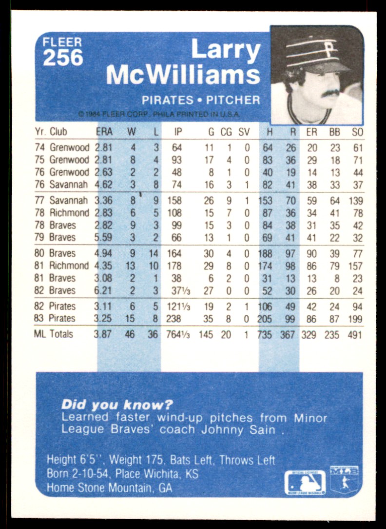 | Description: | Larry McWilliams | | Category: | Baseball | | Year: | 1984 | | Product: | Fleer | | Team: | Pittsburgh Pirates | | Card Number: | 256 | | Memorabilia: | . | | Special: | | | Dimensions: | 3½" x 2½" |