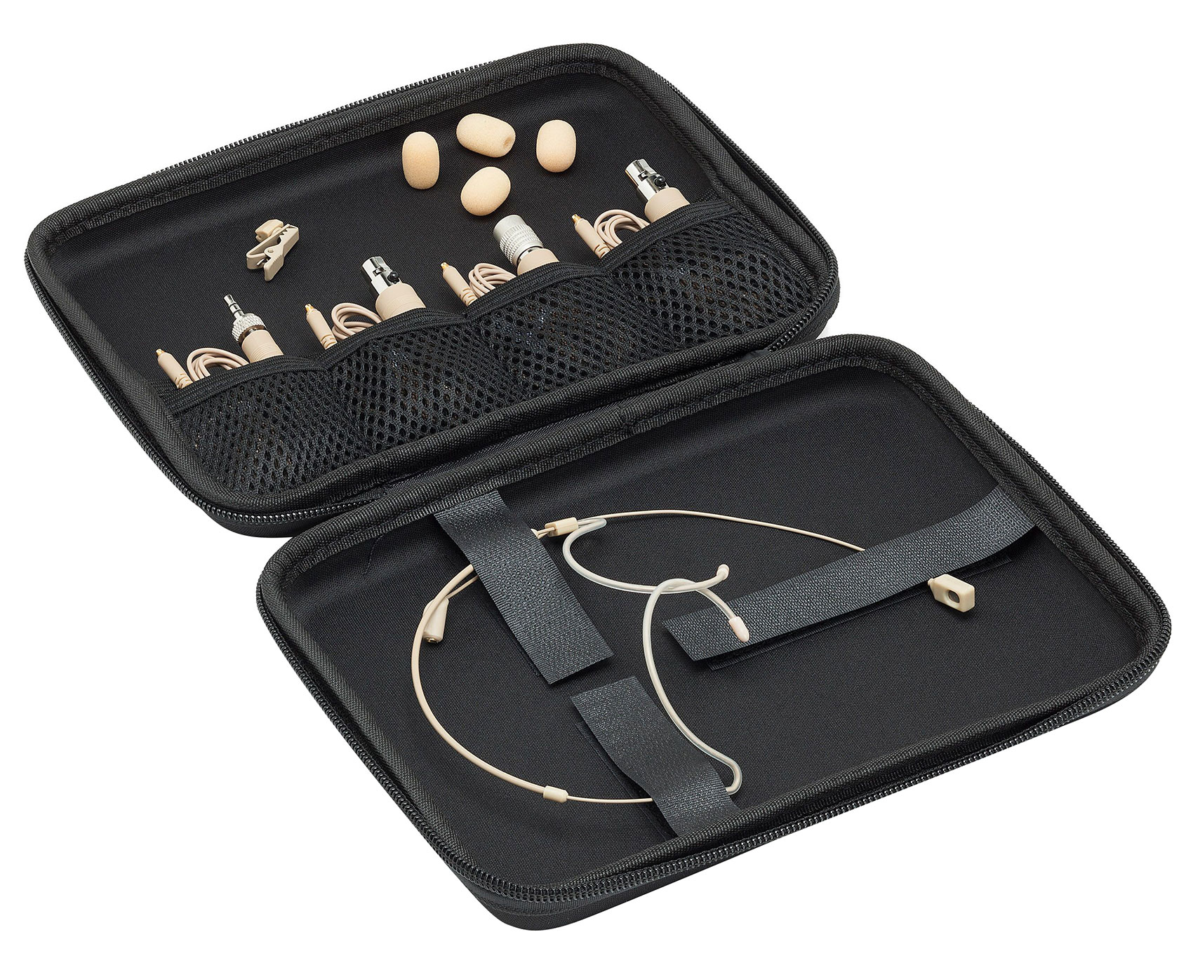 windscreens for reducing wind noise and P-pops, a collar clip for unobtrusive