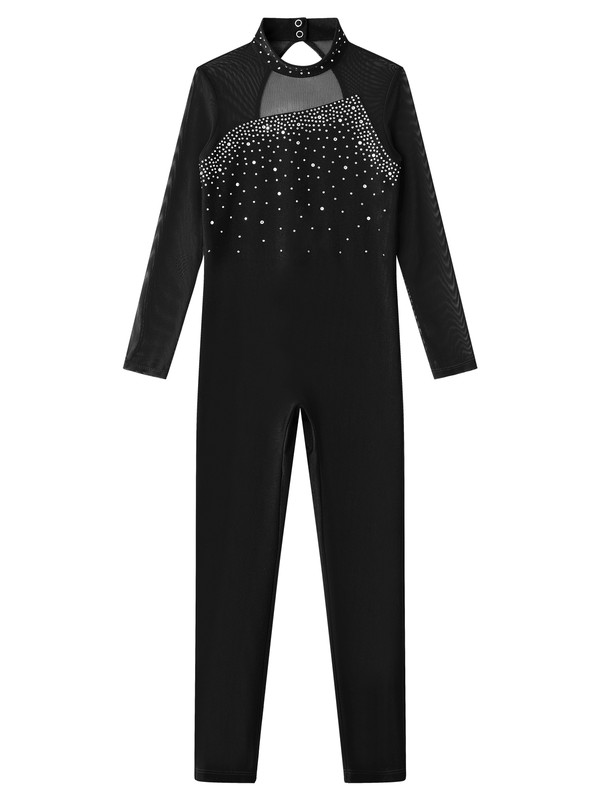 Long sleeve, mock neckline with press buttons, jumpsuit is decorated with shiny rhinestones, hollow back.