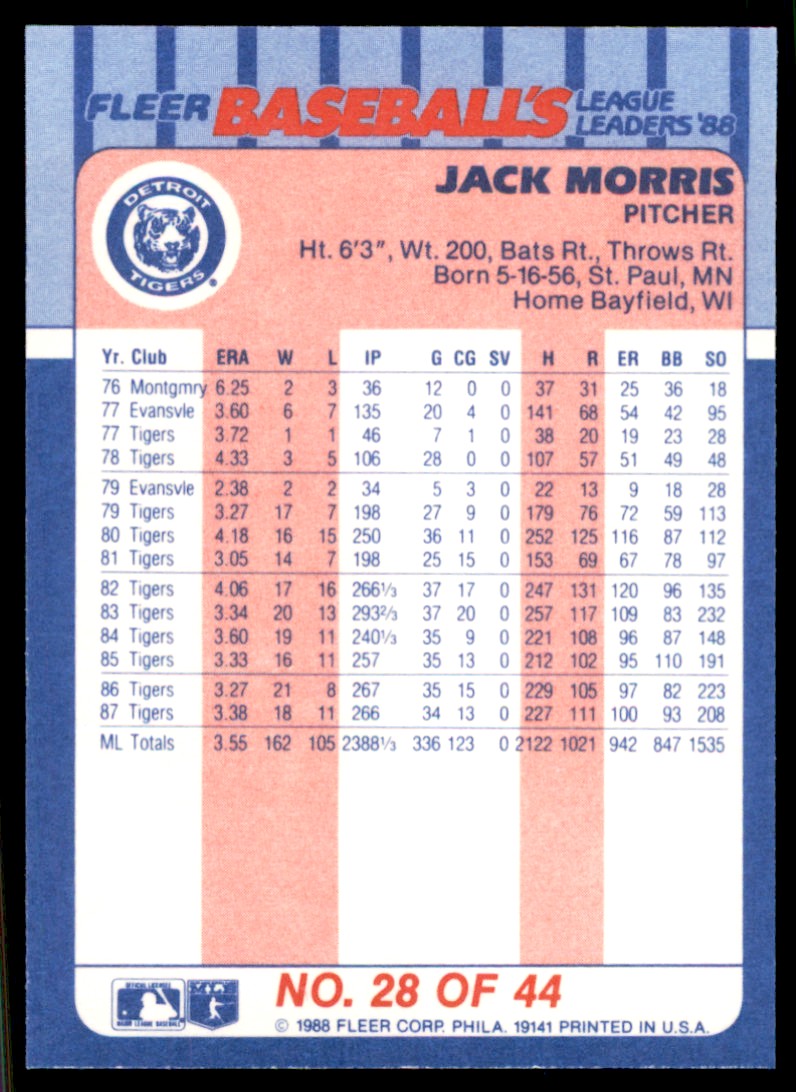 | 1988 Fleer League Leaders 28 Jack Morris |