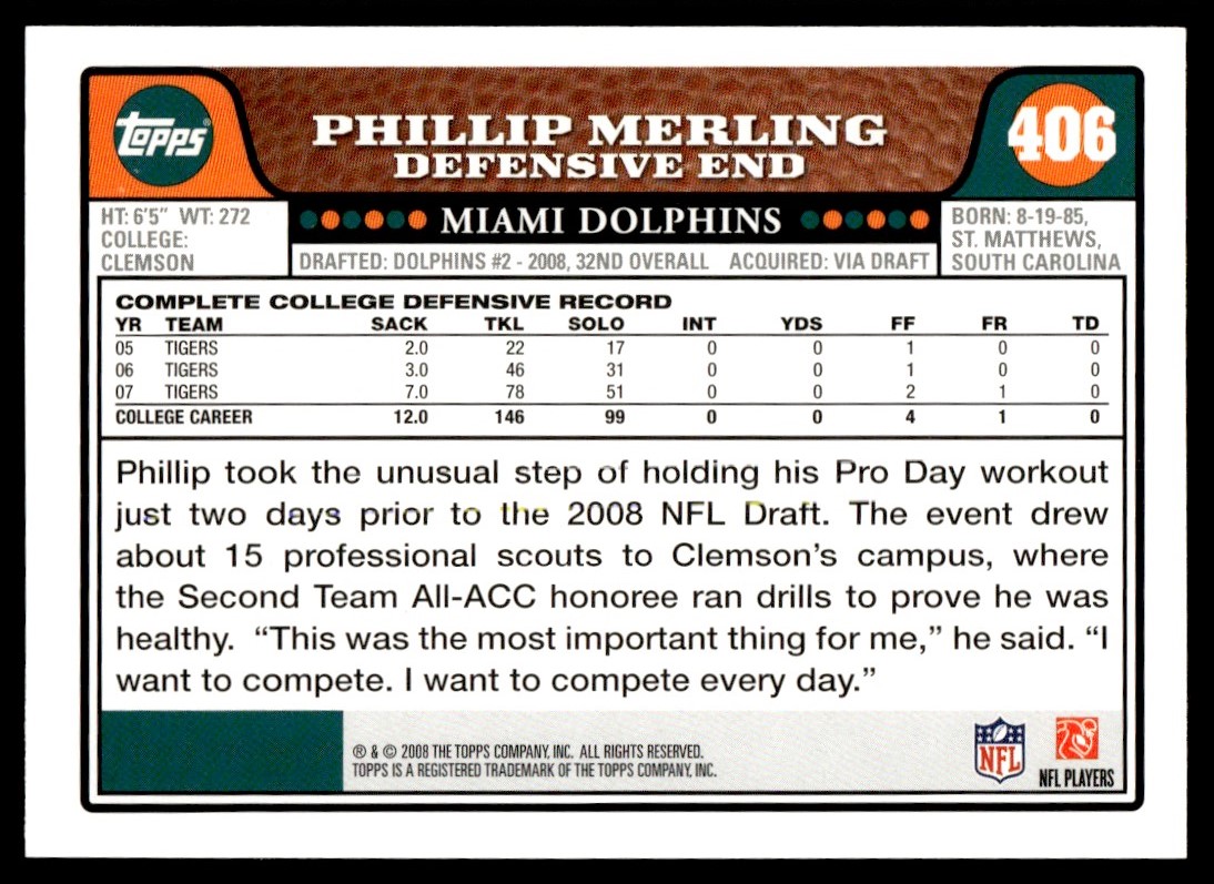 | 2008 Topps Phillip Merling Rookie Miami Dolphins #406 |