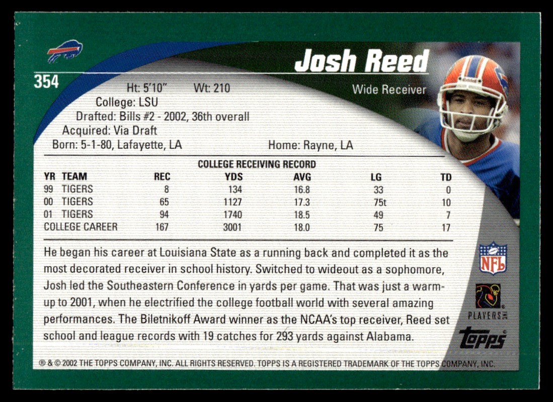 | 2002 Topps Josh Reed Rookie Buffalo Bills #354 |