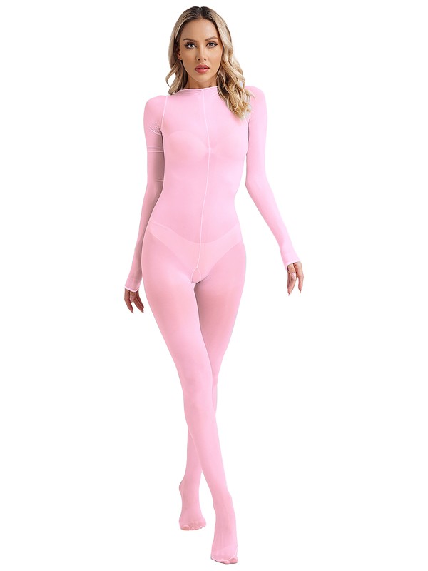 UK Women's Semi Sheer Jumpsuit Long Sleeve Bodycon Full Bodysuit Bodystocking