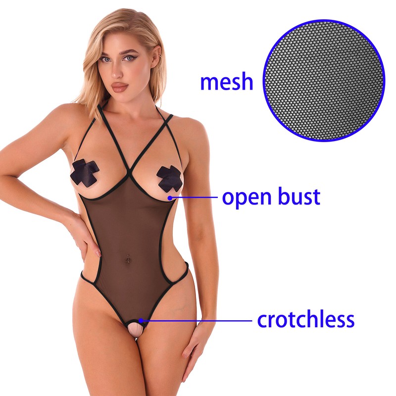 Womens See-through Mesh Crotchless Bodysuit Hollow Out Halter Backless Leotard Lingerie Nightwear.