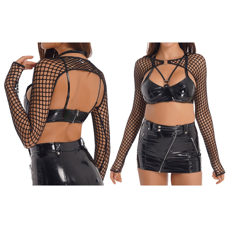 Womens Hollow Out Fishnet Crop Top Cover Ups O Ring Long Sleeve T-shirt.