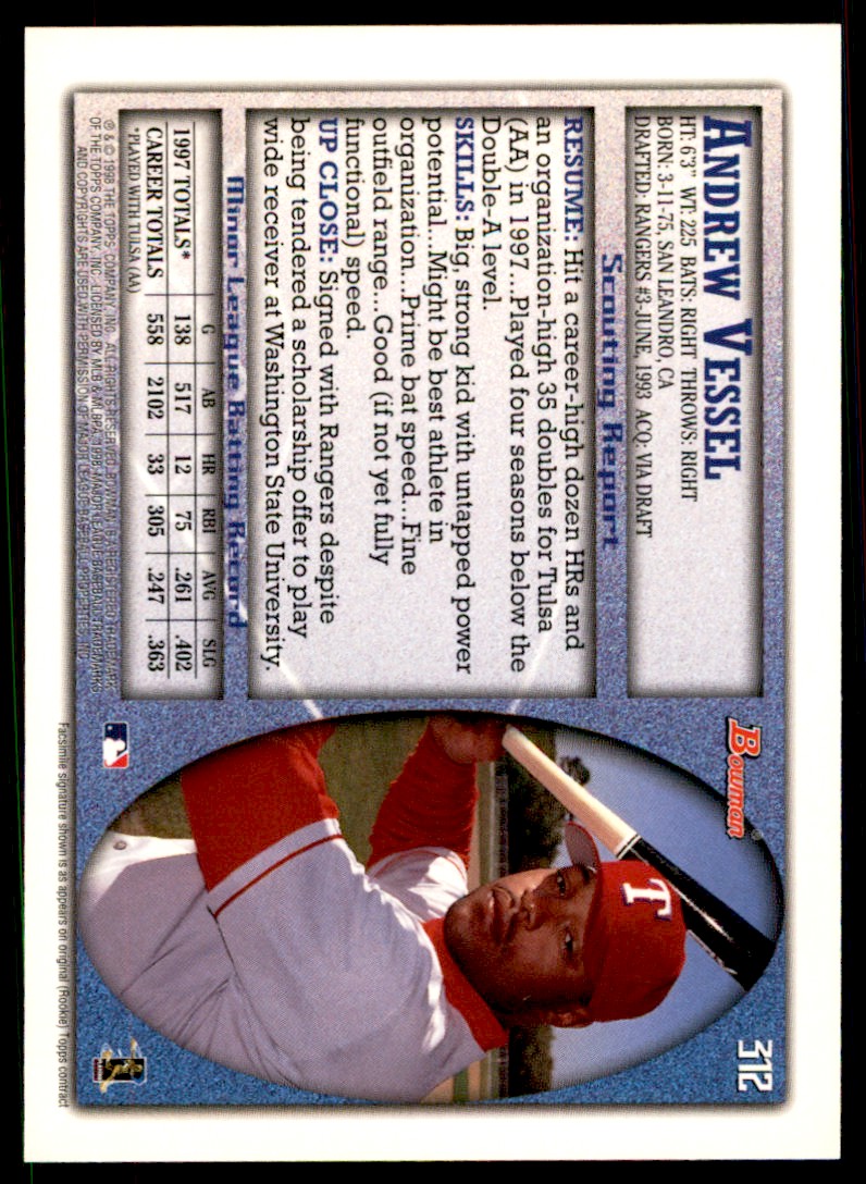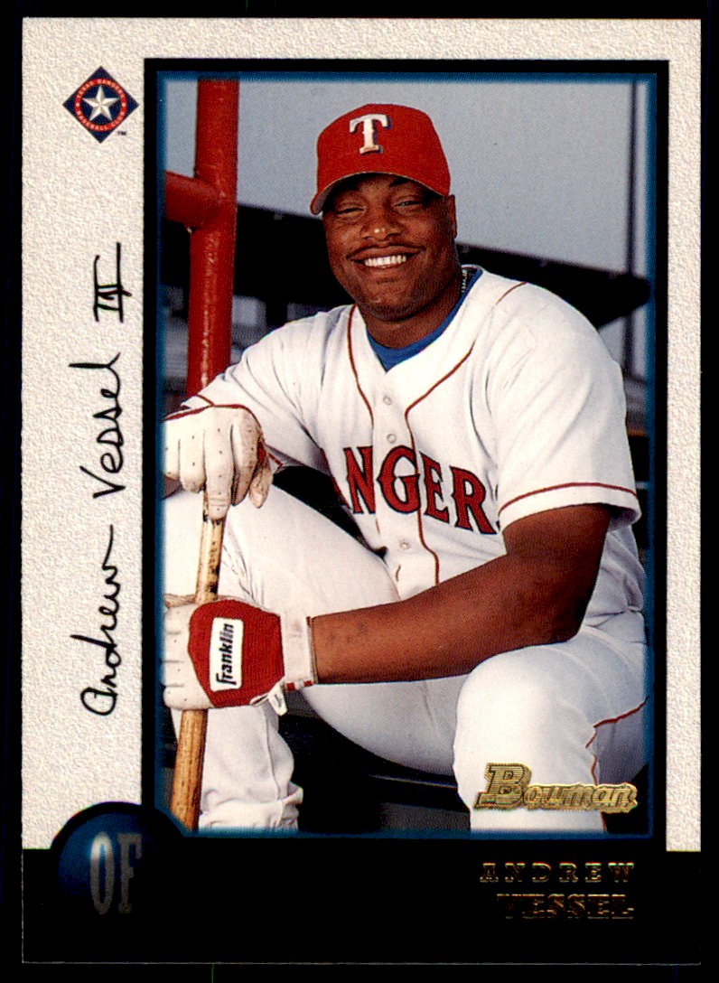 | Description: | Andrew Vessel | | Category: | Baseball | | Year: | 1998 | | Product: | Bowman | | Team: | Texas Rangers | | Card Number: | 312 | | Memorabilia: | . | | Special: | | | Dimensions: | 3½" x 2½" |