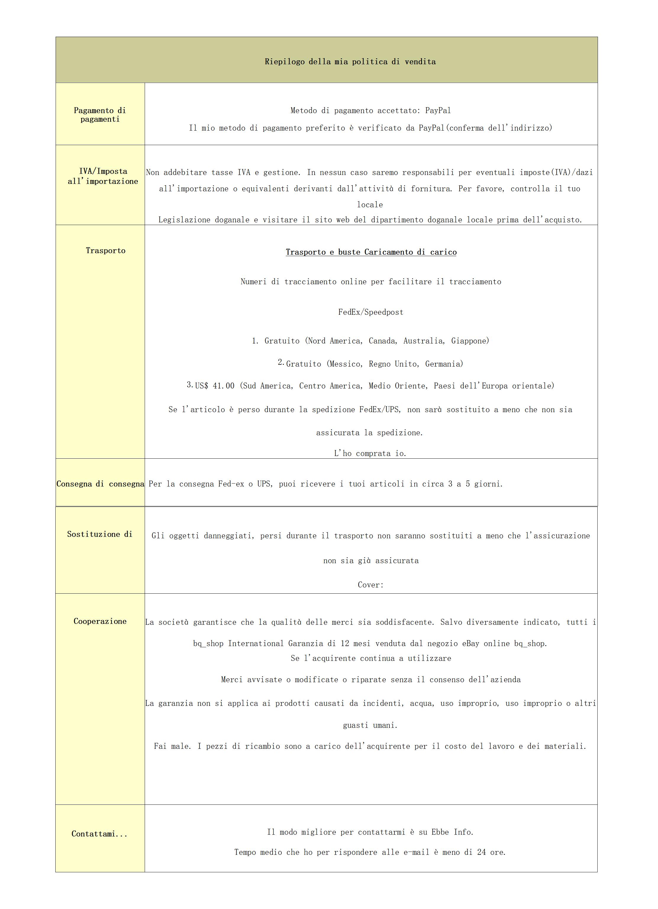TUTTI I telefoni che vendiamo sono di rete GSM Sbloccata e per i nostri telefoni GSM QUAD BAND, possono funzionare per tutti gli operatori di rete GSM nel mondo.Tuttavia, non funzioneranno per la rete CDMA e si prega di verificare con le bande di supporto della rete del vettore locale per assicurarsi che il telefono sia compatibile con prima dell'acquisto.Rimborsi / Scambi possono essere effettuati solo entro 14 giorni dalla ricezione del pacchetto e verrà applicata una tassa di rimborso del 20%.Un rimborso non sarà accettato se l'articolo restituito ha parti mancanti o ha qualsiasi tipo di danneggiamento.Si prega di imballare tutti i pacchetti di ritorno con bolle extra come vi spediamo per la protezione.