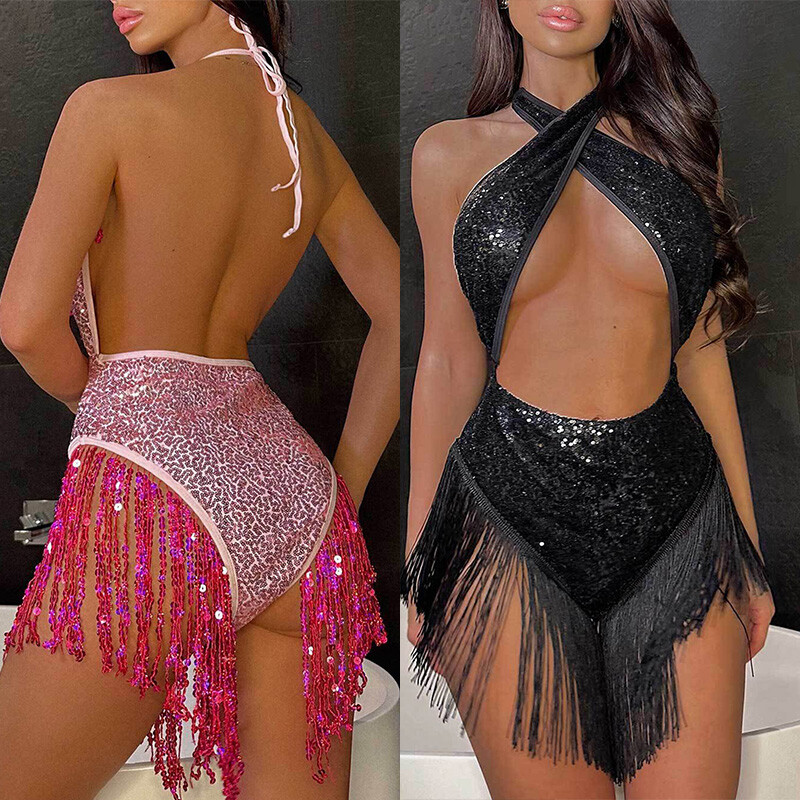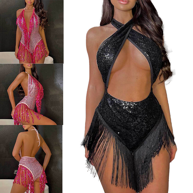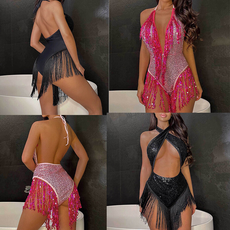 Entworfen mit Neckholder, ärmellos, rückenfrei, mit ausgehöhltem Bauch oder tiefem V-Ausschnitt, glänzenden Pailletten und Quasten, einteiliger Body für Frauen.