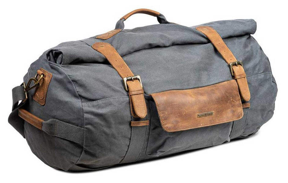 Royal Enfield Classic Duffel Bag - Gray, RLCBGL000006. Simple yet versatile. This classic duffel bag comes with a roll top with secure leather buckle straps. So easy for you to carry your belongings. Attached velcro bike straps to comfort you on longer wearing sessions. Features one large compartment and a small front pocket. Made from 100% cotton waxed canvas fabric. Water resistant with distressed Genuine Leather accents. Carrying handles on each side and detachable shoulder strap. Size: 30" L x 16" H.