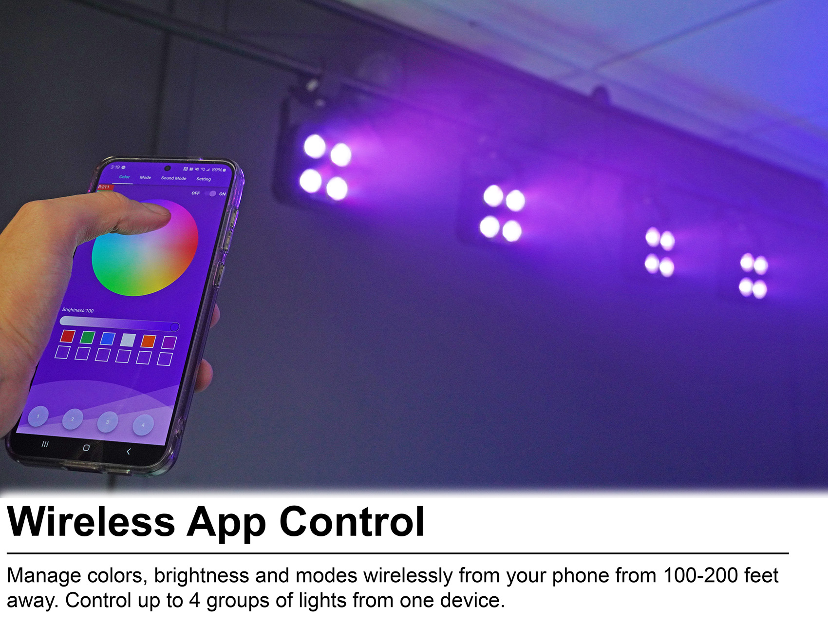Download our wifi app from the app store and you can control up to 4 groups of lights from your tablet or smartphone. You can control the lights from 100-200 feet away! All functions of the lights are available form the app or from the IR remote, or from the menu on the light itself.
